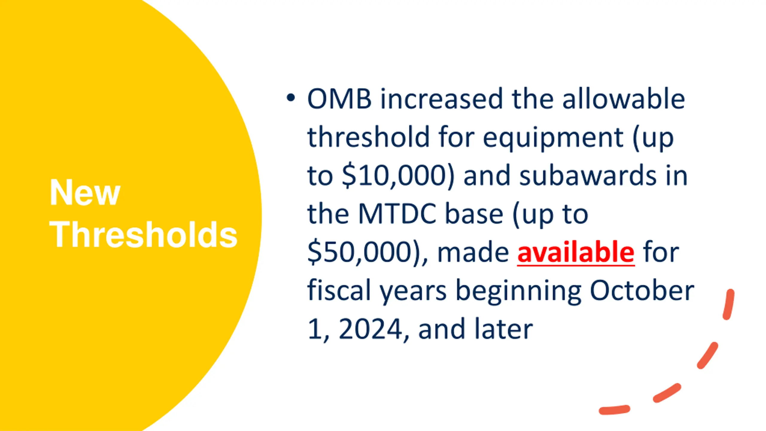 OMB increased the allowable threshold for equipment (up to $10,000) and subawards in the MTDC base (up to $50,000), made available for fiscal years beginning October 1, 2024, and later New Thresholds