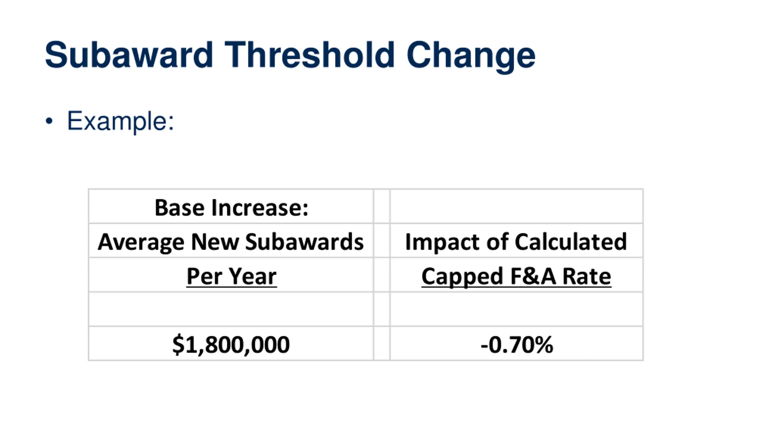 Subaward Threshold Change Example: Base Increase: Average New Subawards Per Year Impact of Calculated Capped F&A Rate $1,800,000 -0.70%