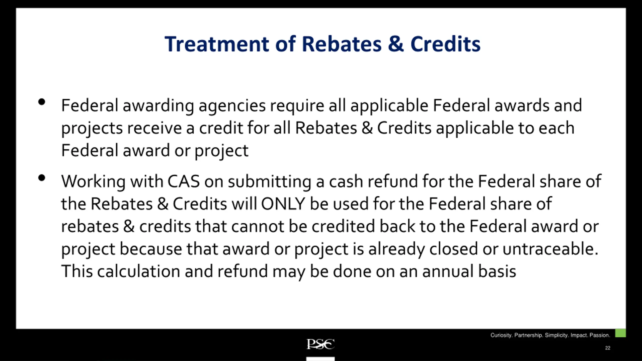 Treatment of Rebates & Credits Federal awarding agencies require all applicable Federal awards and projects receive a credit for all Rebates & Credits applicable to each Federal award or project Working with CAS on submitting a cash refund for the Federal share of the Rebates & Credits will ONLY be used for the Federal share of rebates & credits that cannot be credited back to the Federal award or project because that award or project is already closed or untraceable. This calculation and refund may be done on an annual basis Curiosity. Partnership. Simplicity. Impact. Passion. 22