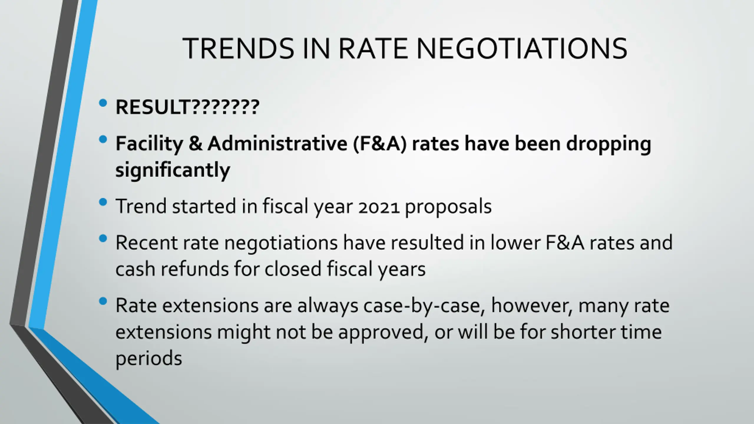 TRENDS IN RATE NEGOTIATIONS RESULT??????? Facility & Administrative (F&A) rates have been dropping significantly Trend started in fiscal year 2021 proposals Recent rate negotiations have resulted in lower F&A rates and cash refunds for closed fiscal years Rate extensions are always case-by-case, however, many rate extensions might not be approved, or will be for shorter time periods