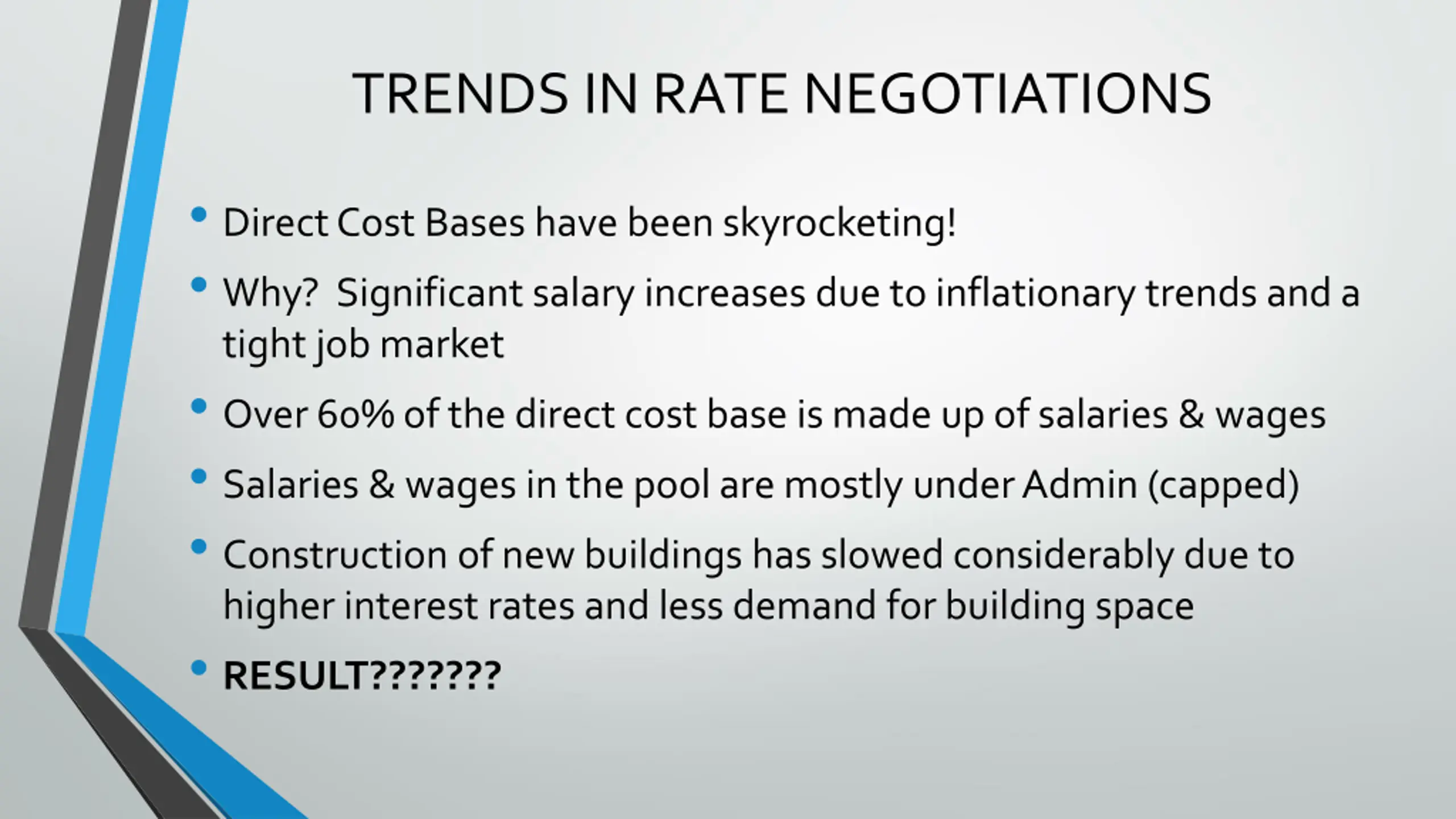 TRENDS IN RATE NEGOTIATIONS Direct Cost Bases have been skyrocketing! Why? Significant salary increases due to inflationary trends and a tight job market Over 60% of the direct cost base is made up of salaries & wages Salaries & wages in the pool are mostly under Admin (capped) Construction of new buildings has slowed considerably due to higher interest rates and less demand for building space RESULT???????