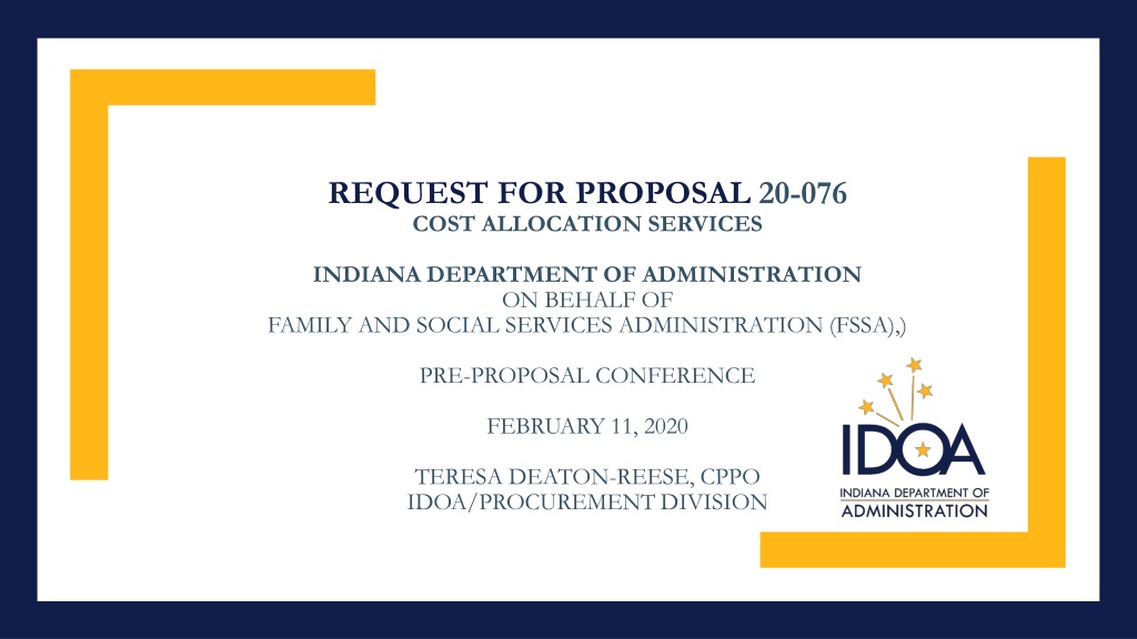 REQUEST FOR PROPOSAL 20-076 COST ALLOCATION SERVICES INDIANA DEPARTMENT OF ADMINISTRATION ON BEHALF OF FAMILY AND SOCIAL SERVICES ADMINISTRATION (FSSA),) PRE-PROPOSAL CONFERENCE FEBRUARY 11, 2020 TERESA DEATON-REESE, CPPO IDOA/PROCUREMENT DIVISION