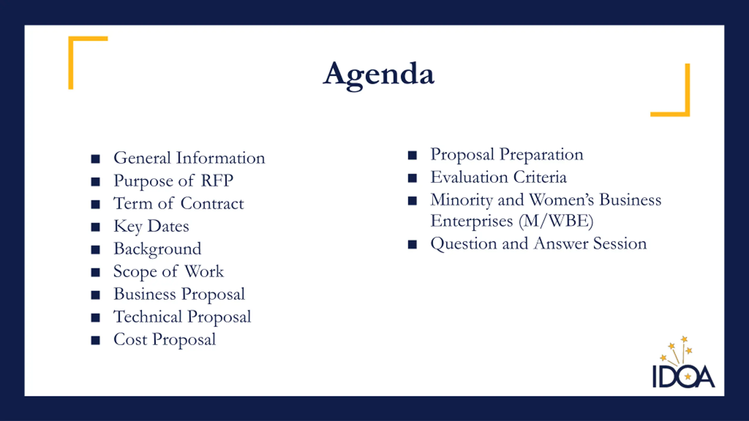 Agenda Proposal Preparation Evaluation Criteria Minority and Women s Business Enterprises (M/WBE) Question and Answer Session General Information Purpose of RFP Term of Contract Key Dates Background Scope of Work Business Proposal Technical Proposal Cost Proposal