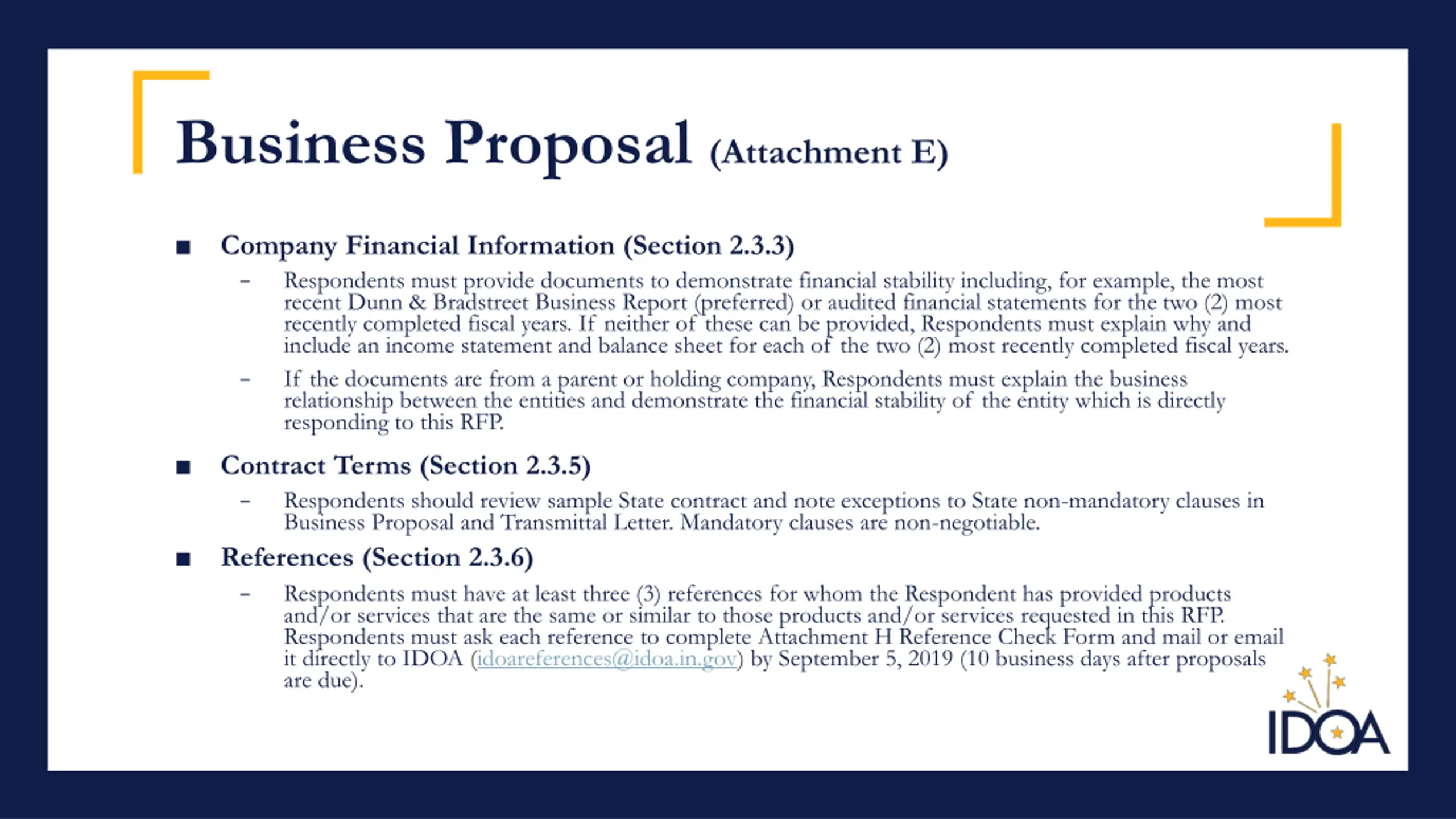 Business Proposal (Attachment E) Company Financial Information (Section 2.3.3) Respondents must provide documents to demonstrate financial stability including, for example, the most recent Dunn & Bradstreet Business Report (preferred) or audited financial statements for the two (2) most recently completed fiscal years. If neither of these can be provided, Respondents must explain why and include an income statement and balance sheet for each of the two (2) most recently completed fiscal years. If the documents are from a parent or holding company, Respondents must explain the business relationship between the entities and demonstrate the financial stability of the entity which is directly responding to this RFP. Contract Terms (Section 2.3.5) Respondents should review sample State contract and note exceptions to State non-mandatory clauses in Business Proposal and Transmittal Letter. Mandatory clauses are non-negotiable. References (Section 2.3.6) Respondents must have at least three (3) references for whom the Respondent has provided products and/or services that are the same or similar to those products and/or services requested in this RFP. Respondents must ask each reference to complete Attachment H Reference Check Form and mail or email it directly to IDOA (idoareferences@idoa.in.gov) by September 5, 2019 (10 business days after proposals are due).