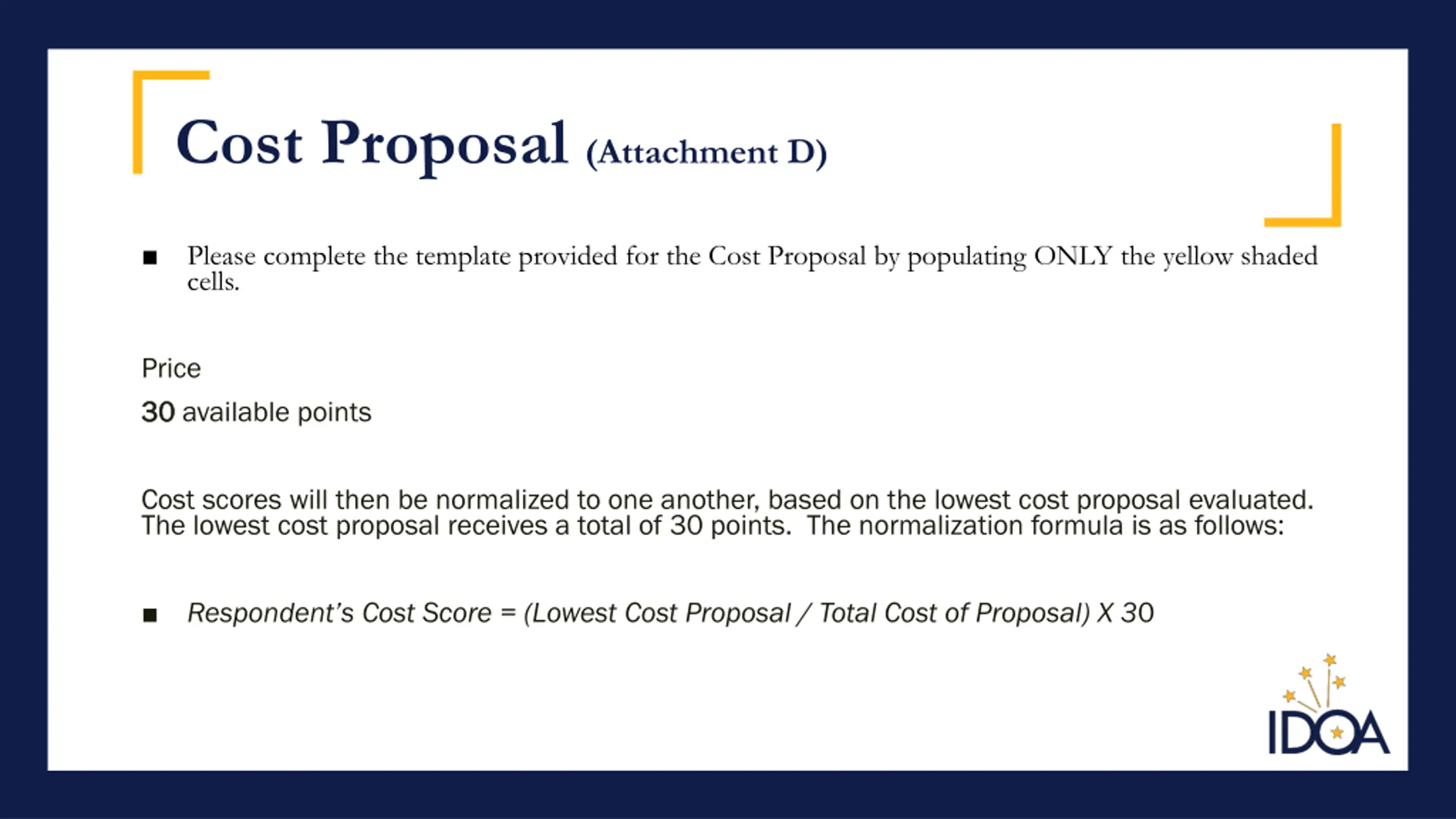 Cost Proposal (Attachment D) Please complete the template provided for the Cost Proposal by populating ONLY the yellow shaded cells. Price 30 30 available points Cost scores will then be normalized to one another, based on the lowest cost proposal evaluated. The lowest cost proposal receives a total of 30 points. The normalization formula is as follows: Respondent s Cost Score = (Lowest Cost Proposal / Total Cost of Proposal) X 30