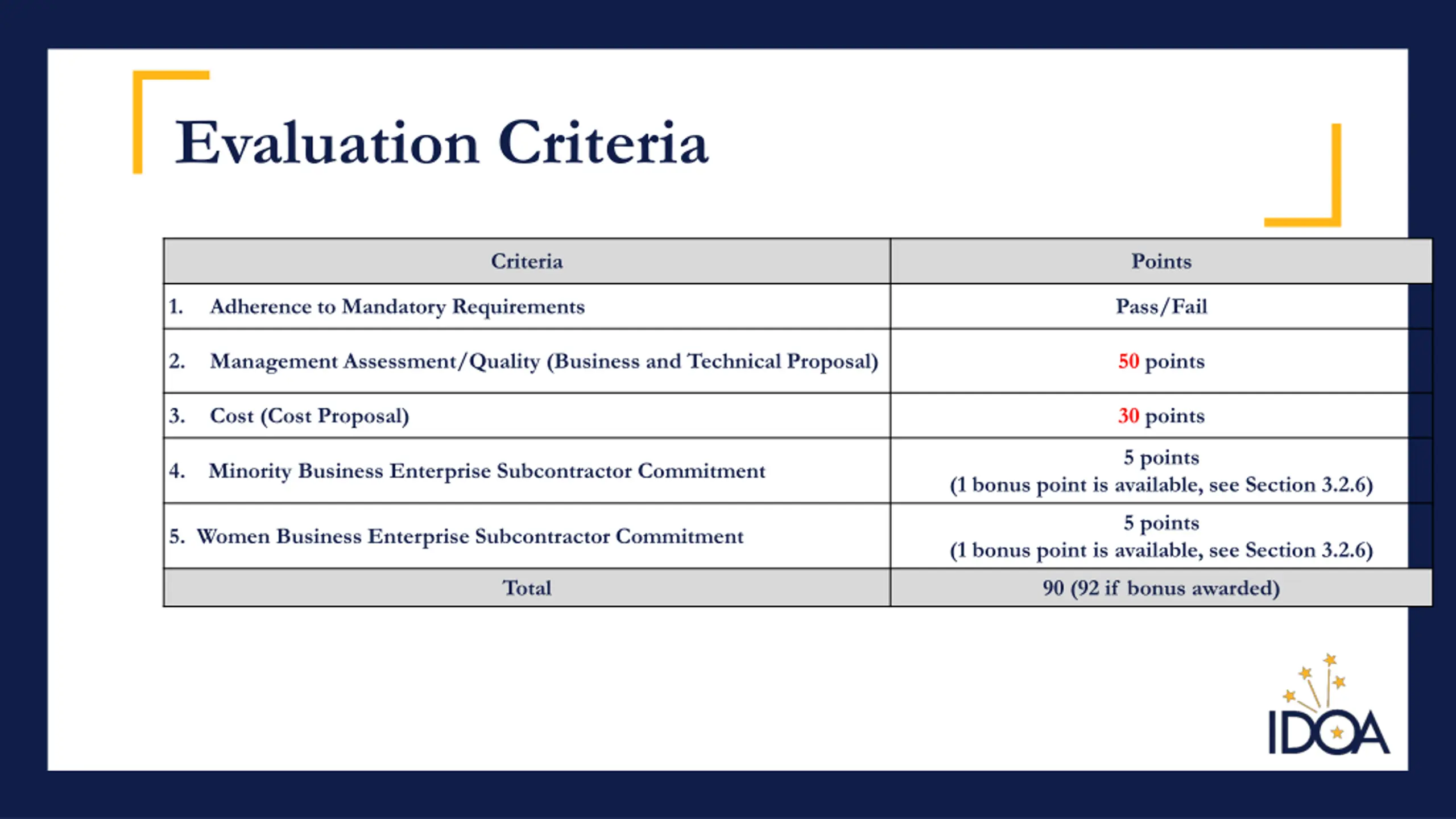 Evaluation Criteria Criteria Points 1. Adherence to Mandatory Requirements Pass/Fail 2. Management Assessment/Quality (Business and Technical Proposal) 50 points 3. Cost (Cost Proposal) 30 points 5 points 4. Minority Business Enterprise Subcontractor Commitment (1 bonus point is available, see Section 3.2.6) 5 points 5. Women Business Enterprise Subcontractor Commitment (1 bonus point is available, see Section 3.2.6) Total 90 (92 if bonus awarded)