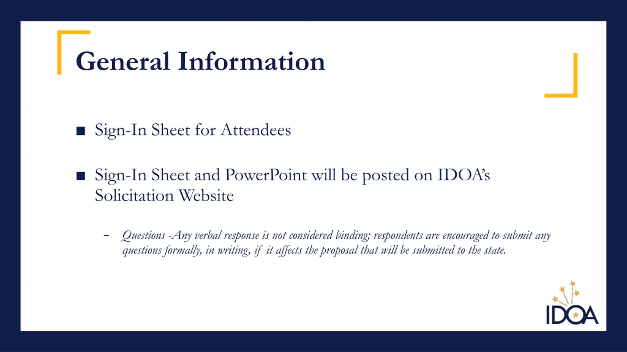 General Information Sign-In Sheet for Attendees Sign-In Sheet and PowerPoint will be posted on IDOA s Solicitation Website Questions -Any verbal response is not considered binding; respondents are encouraged to submit any questions formally, in writing, if it affects the proposal that will be submitted to the state.