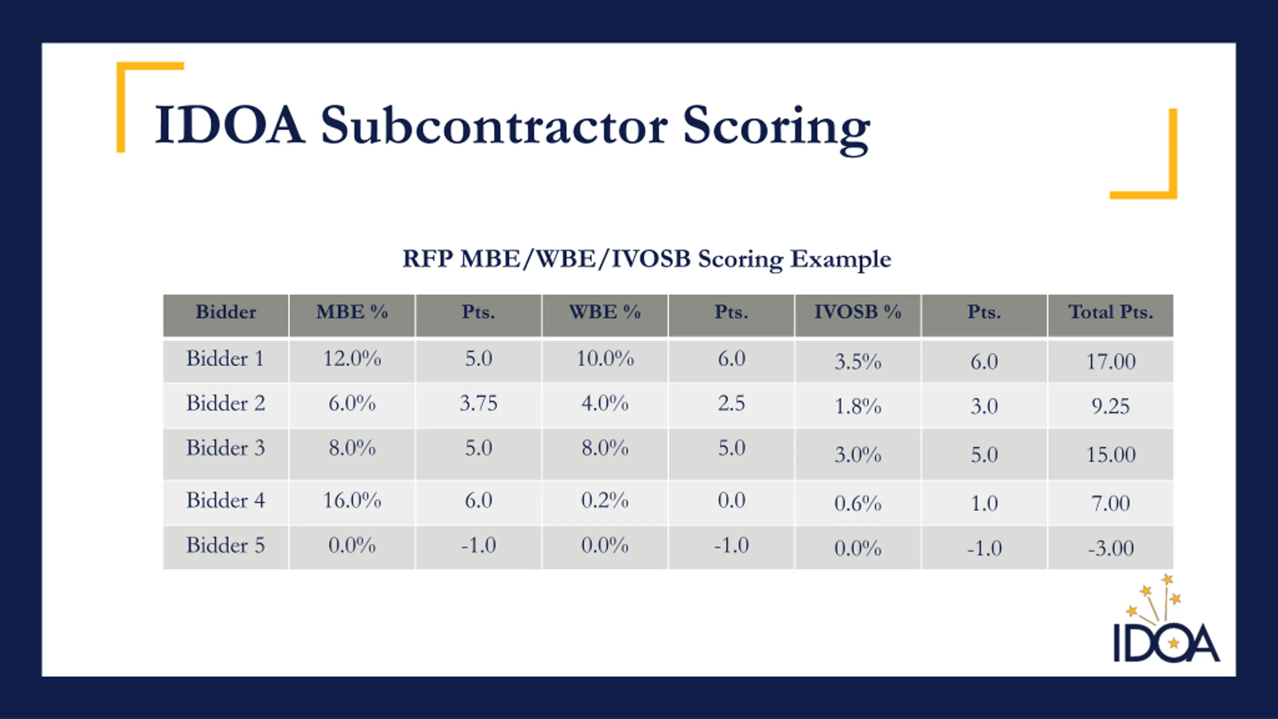 IDOA Subcontractor Scoring RFP MBE/WBE/IVOSB Scoring Example Bidder MBE % Pts. WBE % Pts. IVOSB % Pts. Total Pts. Bidder 1 12.0% 5.0 10.0% 6.0 3.5% 6.0 17.00 Bidder 2 6.0% 3.75 4.0% 2.5 1.8% 3.0 9.25 Bidder 3 8.0% 5.0 8.0% 5.0 3.0% 5.0 15.00 Bidder 4 16.0% 6.0 0.2% 0.0 0.6% 1.0 7.00 Bidder 5 0.0% -1.0 0.0% -1.0 0.0% -1.0 -3.00