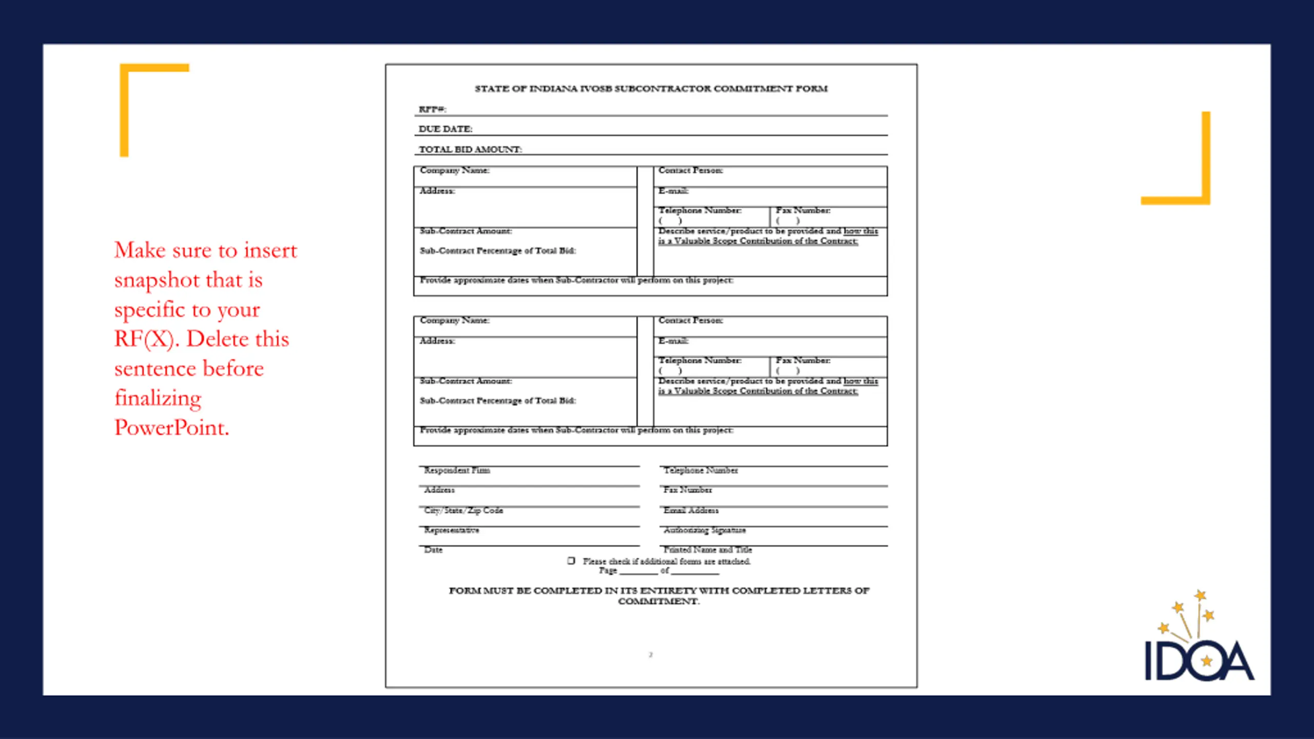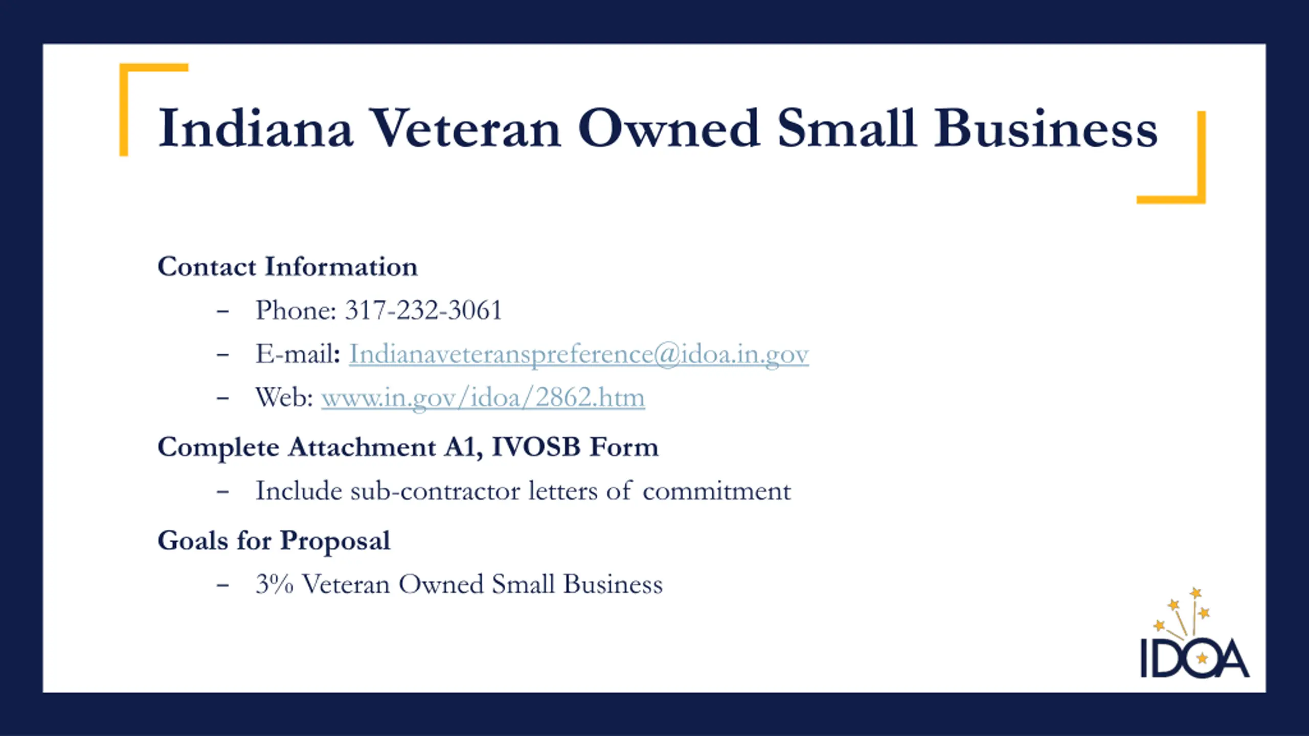 Indiana Veteran Owned Small Business Contact Information Phone: 317-232-3061 E-mail: Indianaveteranspreference@idoa.in.gov Web: www.in.gov/idoa/2862.htm Complete Attachment A1, IVOSB Form Include sub-contractor letters of commitment Goals for Proposal 3% Veteran Owned Small Business