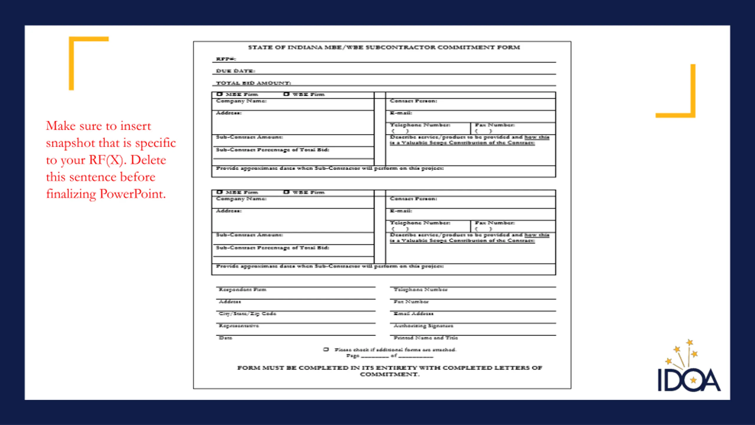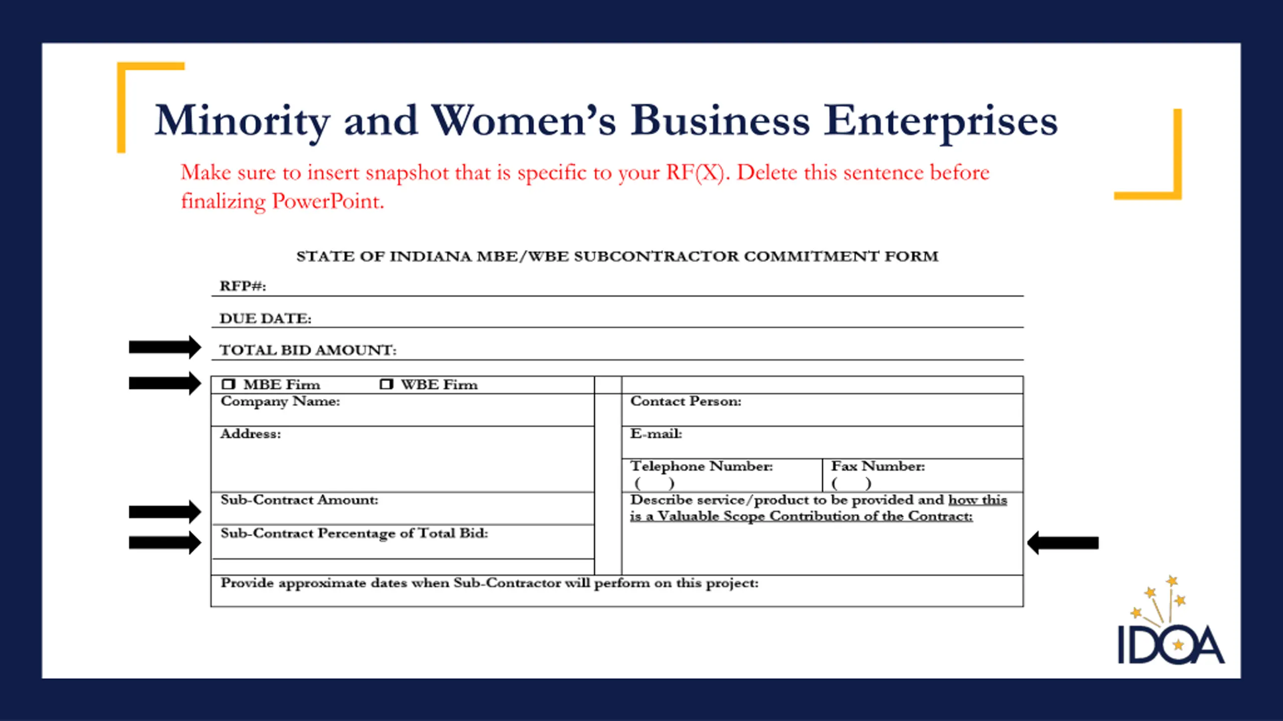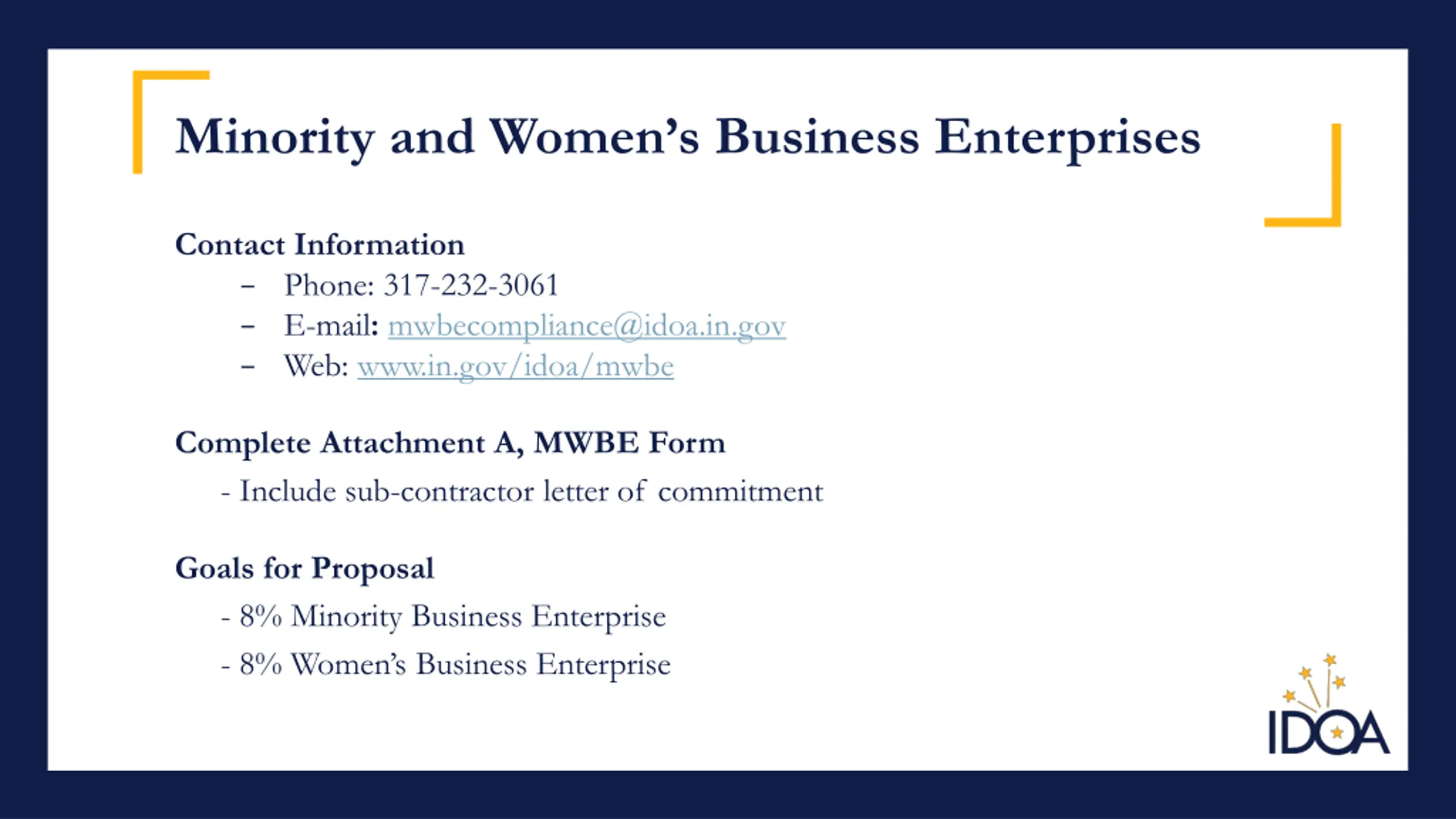 Minority and Womens Business Enterprises Contact Information Phone: 317-232-3061 E-mail: mwbecompliance@idoa.in.gov Web: www.in.gov/idoa/mwbe Complete Attachment A, MWBE Form - Include sub-contractor letter of commitment Goals for Proposal - 8% Minority Business Enterprise - 8% Women s Business Enterprise
