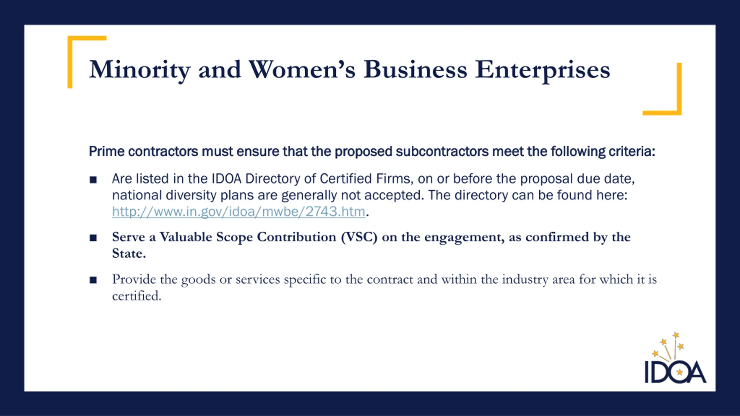Minority and Womens Business Enterprises Prime contractors must ensure that the proposed subcontractors meet the following criteria: Prime contractors must ensure that the proposed subcontractors meet the following criteria: Are listed in the IDOA Directory of Certified Firms, on or before the proposal due date, national diversity plans are generally not accepted. The directory can be found here: http://www.in.gov/idoa/mwbe/2743.htm. Serve a Valuable Scope Contribution (VSC) on the engagement, as confirmed by the State. Provide the goods or services specific to the contract and within the industry area for which it is certified.