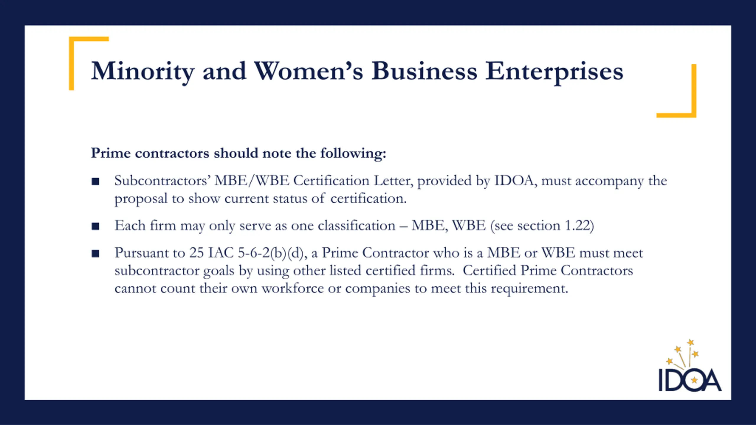 Minority and Womens Business Enterprises Prime contractors should note the following: Subcontractors MBE/WBE Certification Letter, provided by IDOA, must accompany the proposal to show current status of certification. Each firm may only serve as one classification MBE, WBE (see section 1.22) Pursuant to 25 IAC 5-6-2(b)(d), a Prime Contractor who is a MBE or WBE must meet subcontractor goals by using other listed certified firms. Certified Prime Contractors cannot count their own workforce or companies to meet this requirement.