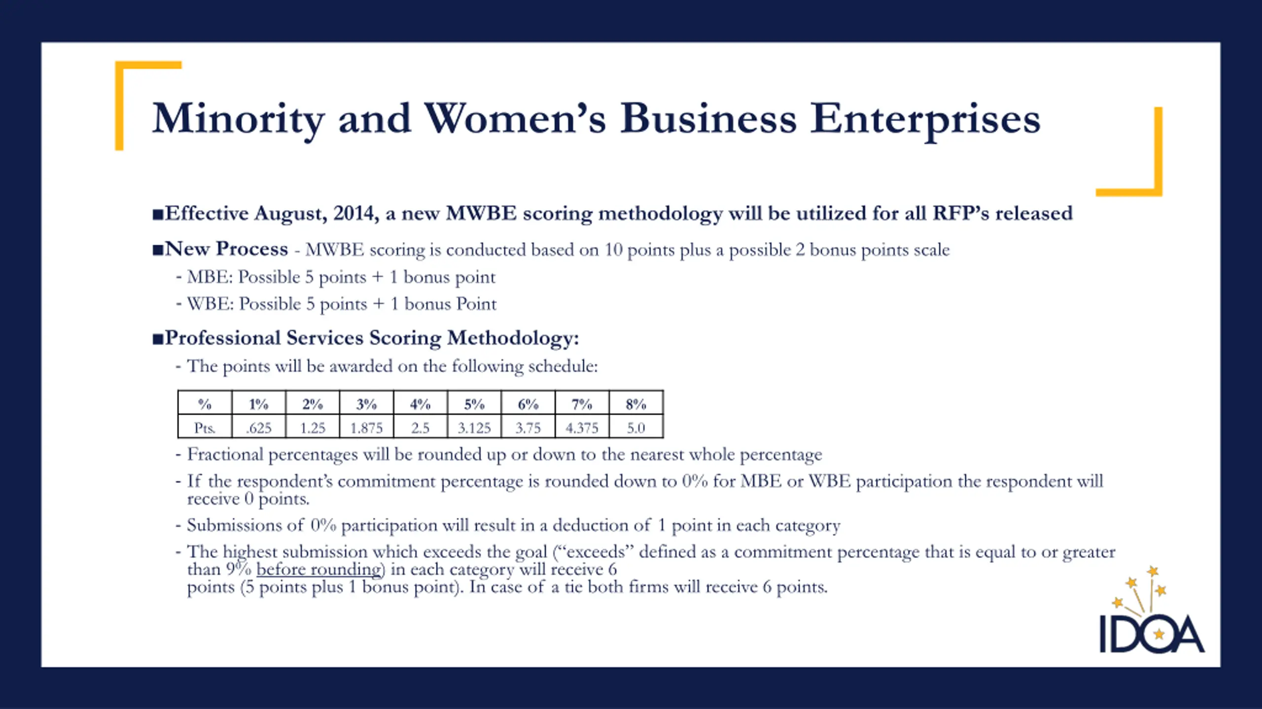 Minority and Womens Business Enterprises Effective August, 2014, a new MWBE scoring methodology will be utilized for all RFP s released New Process- MWBE scoring is conducted based on 10 points plus a possible 2 bonus points scale - MBE: Possible 5 points + 1 bonus point - WBE: Possible 5 points + 1 bonus Point Professional Services Scoring Methodology: - The points will be awarded on the following schedule: % Pts. 1% .625 2% 1.25 3% 1.875 4% 2.5 5% 3.125 6% 3.75 7% 4.375 8% 5.0 - Fractional percentages will be rounded up or down to the nearest whole percentage - If the respondent s commitment percentage is rounded down to 0% for MBE or WBE participation the respondent will receive 0 points. - Submissions of 0% participation will result in a deduction of 1 point in each category - The highest submission which exceeds the goal ( exceeds defined as a commitment percentage that is equal to or greater than 9% before rounding) in each category will receive 6 points (5 points plus 1 bonus point). In case of a tie both firms will receive 6 points.