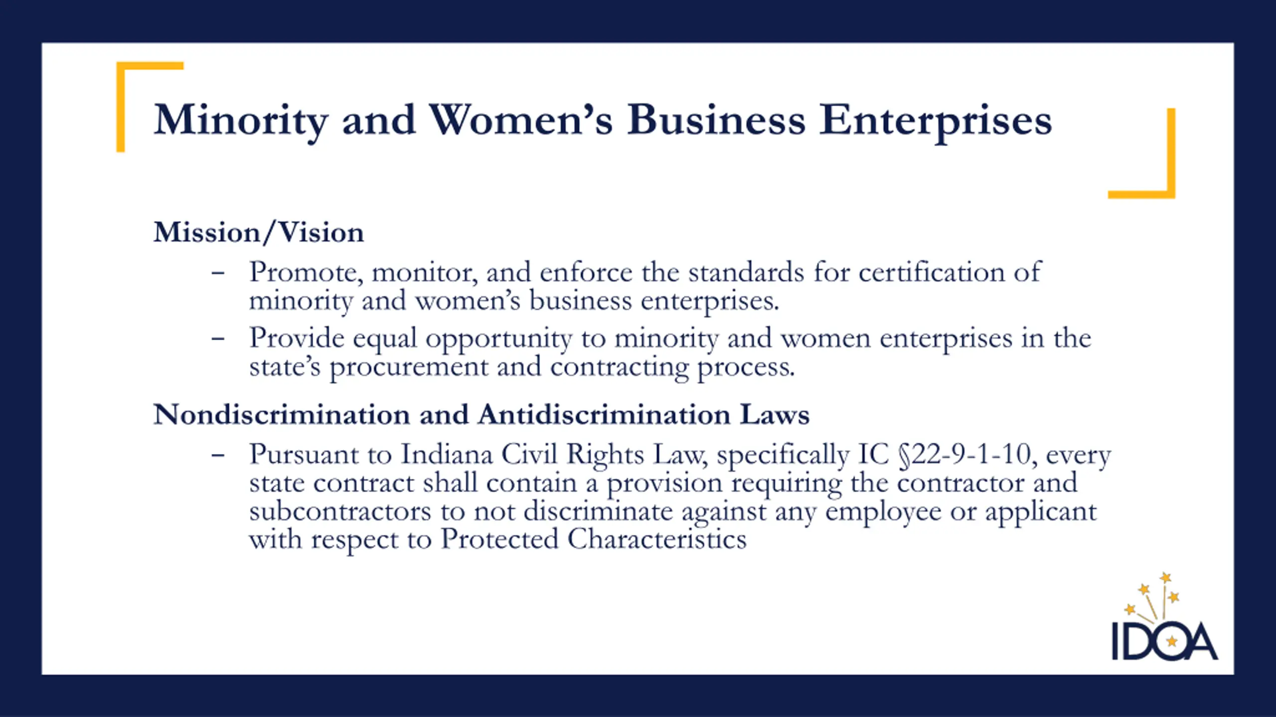 Minority and Womens Business Enterprises Mission/Vision Promote, monitor, and enforce the standards for certification of minority and women s business enterprises. Provide equal opportunity to minority and women enterprises in the state s procurement and contracting process. Nondiscrimination and Antidiscrimination Laws Pursuant to Indiana Civil Rights Law, specifically IC 22-9-1-10, every state contract shall contain a provision requiring the contractor and subcontractors to not discriminate against any employee or applicant with respect to Protected Characteristics