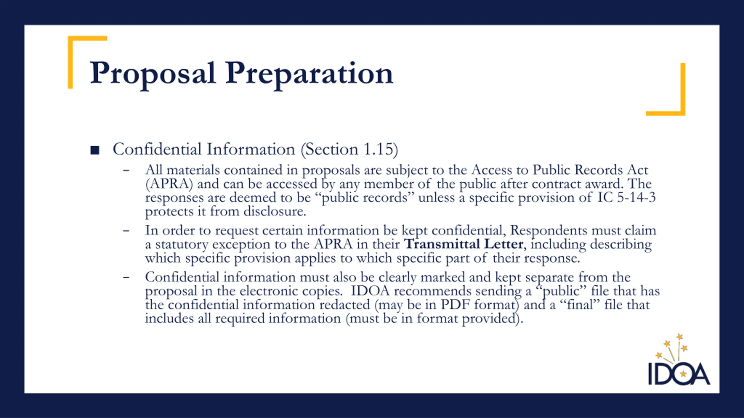 Proposal Preparation Confidential Information (Section 1.15) All materials contained in proposals are subject to the Access to Public Records Act (APRA) and can be accessed by any member of the public after contract award. The responses are deemed to be public records unless a specific provision of IC 5-14-3 protects it from disclosure. In order to request certain information be kept confidential, Respondents must claim a statutory exception to the APRA in their Transmittal Letter, including describing which specific provision applies to which specific part of their response. Confidential information must also be clearly marked and kept separate from the proposal in the electronic copies. IDOA recommends sending a public file that has the confidential information redacted (may be in PDF format) and a final file that includes all required information (must be in format provided).