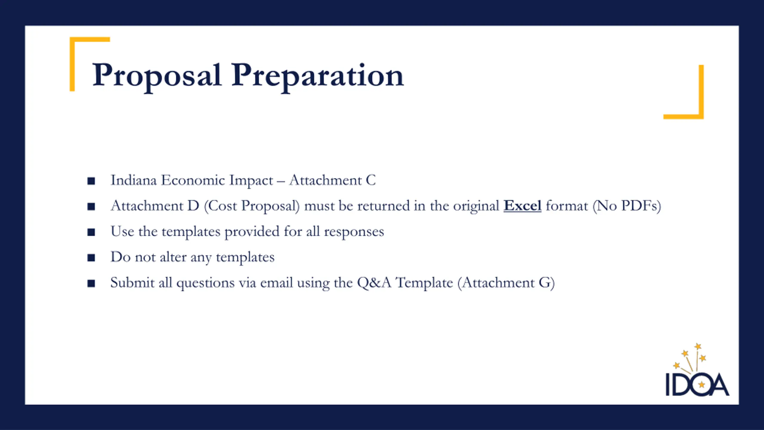 Proposal Preparation Indiana Economic Impact Attachment C Attachment D (Cost Proposal) must be returned in the original Excel format (No PDFs) Use the templates provided for all responses Do not alter any templates Submit all questions via email using the Q&A Template (Attachment G)