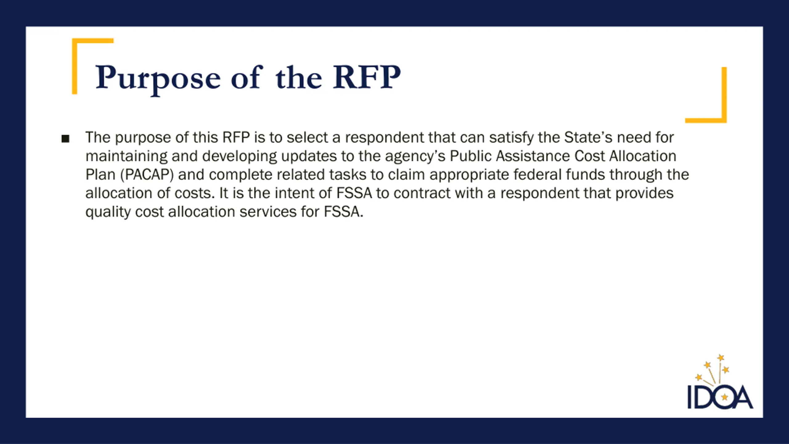 Purpose of the RFP The purpose of this RFP is to select a respondent that can satisfy the State s need for maintaining and developing updates to the agency s Public Assistance Cost Allocation Plan (PACAP) and complete related tasks to claim appropriate federal funds through the allocation of costs. It is the intent of FSSA to contract with a respondent that provides quality cost allocation services for FSSA.