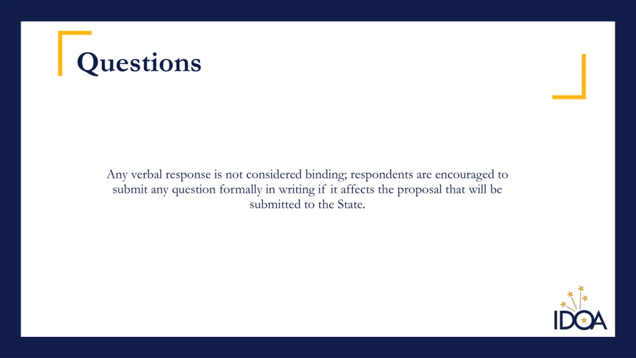 Questions Any verbal response is not considered binding; respondents are encouraged to submit any question formally in writing if it affects the proposal that will be submitted to the State.