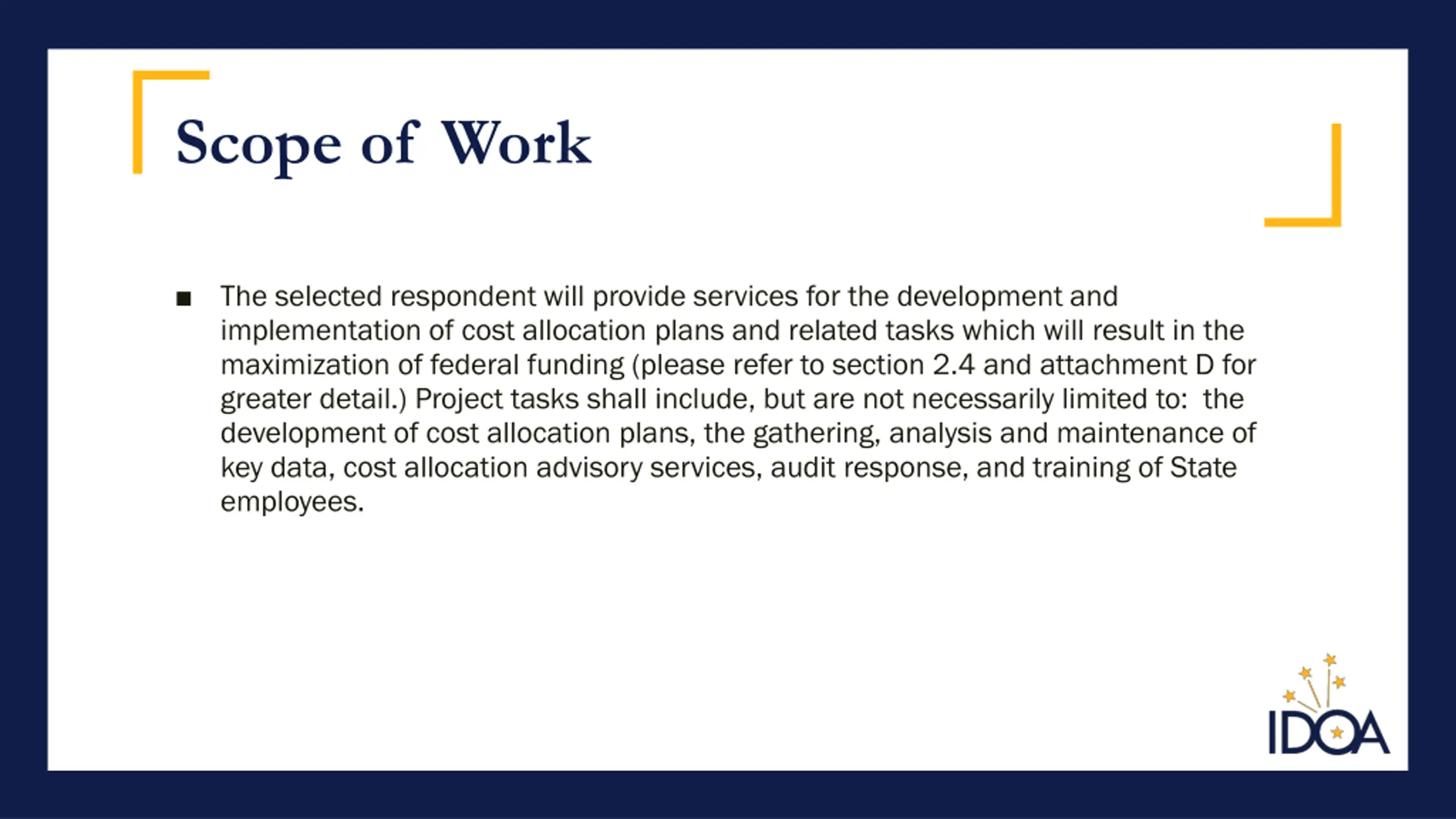 Scope of Work The selected respondent will provide services for the development and implementation of cost allocation plans and related tasks which will result in the maximization of federal funding (please refer to section 2.4 and attachment D for greater detail.) Project tasks shall include, but are not necessarily limited to: the development of cost allocation plans, the gathering, analysis and maintenance of key data, cost allocation advisory services, audit response, and training of State employees.
