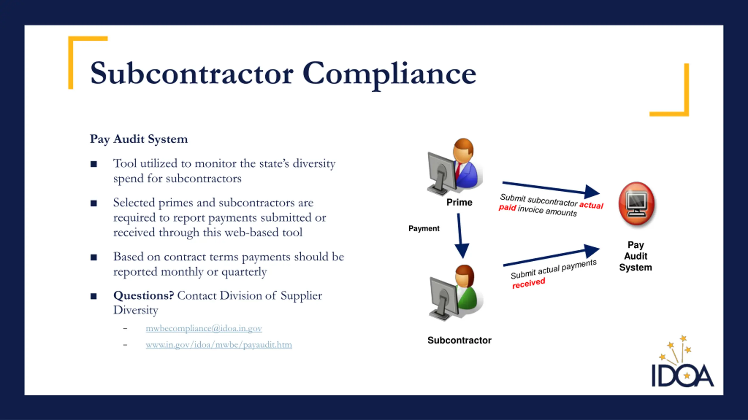 Subcontractor Compliance Pay Audit System Tool utilized to monitor the state s diversity spend for subcontractors Selected primes and subcontractors are required to report payments submitted or received through this web-based tool Prime Payment Pay Audit System Based on contract terms payments should be reported monthly or quarterly Questions? Contact Division of Supplier Diversity mwbecompliance@idoa.in.gov Subcontractor www.in.gov/idoa/mwbe/payaudit.htm