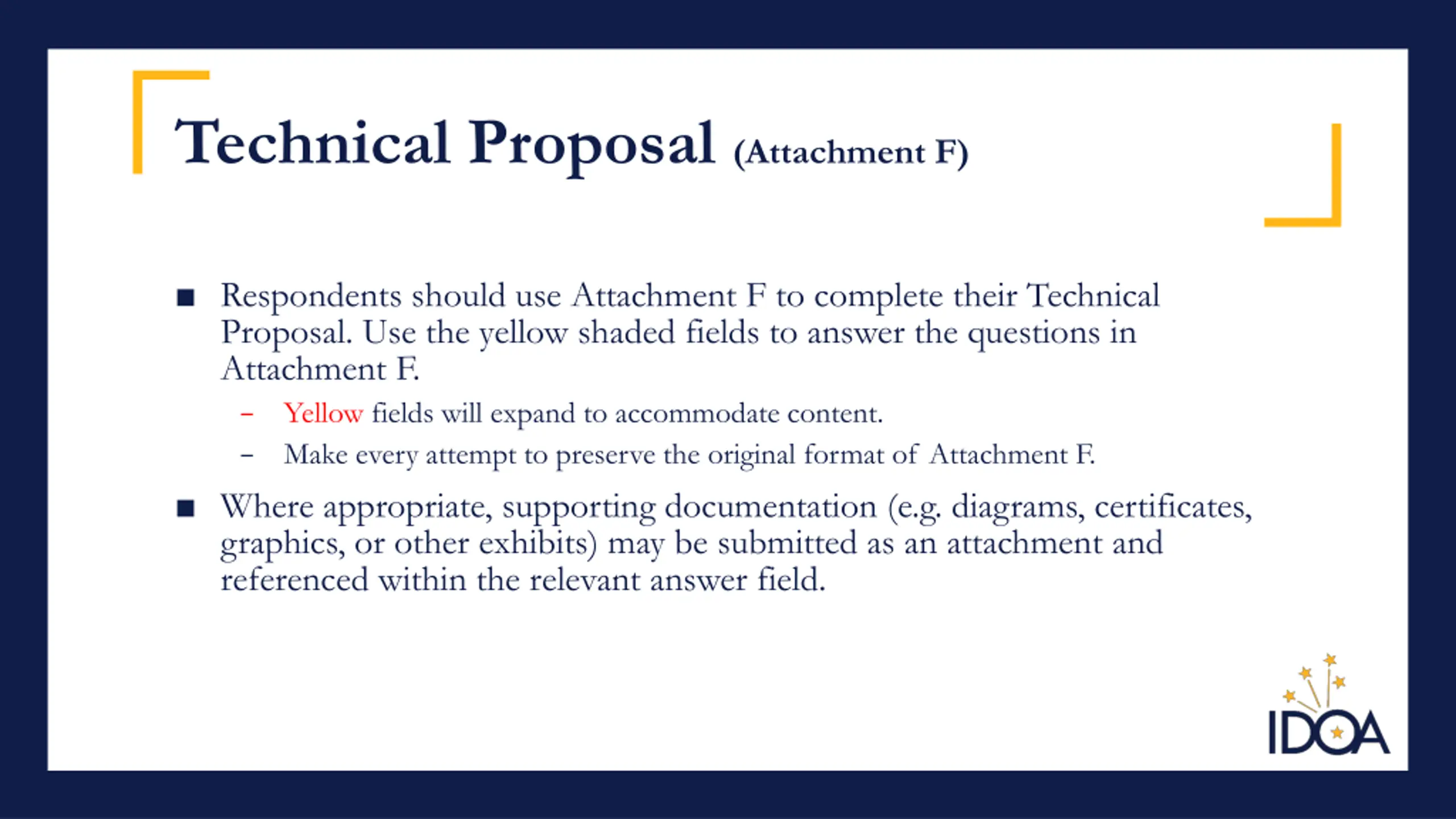 Technical Proposal (Attachment F) Respondents should use Attachment F to complete their Technical Proposal. Use the yellow shaded fields to answer the questions in Attachment F. Yellow fields will expand to accommodate content. Make every attempt to preserve the original format of Attachment F. Where appropriate, supporting documentation (e.g. diagrams, certificates, graphics, or other exhibits) may be submitted as an attachment and referenced within the relevant answer field.