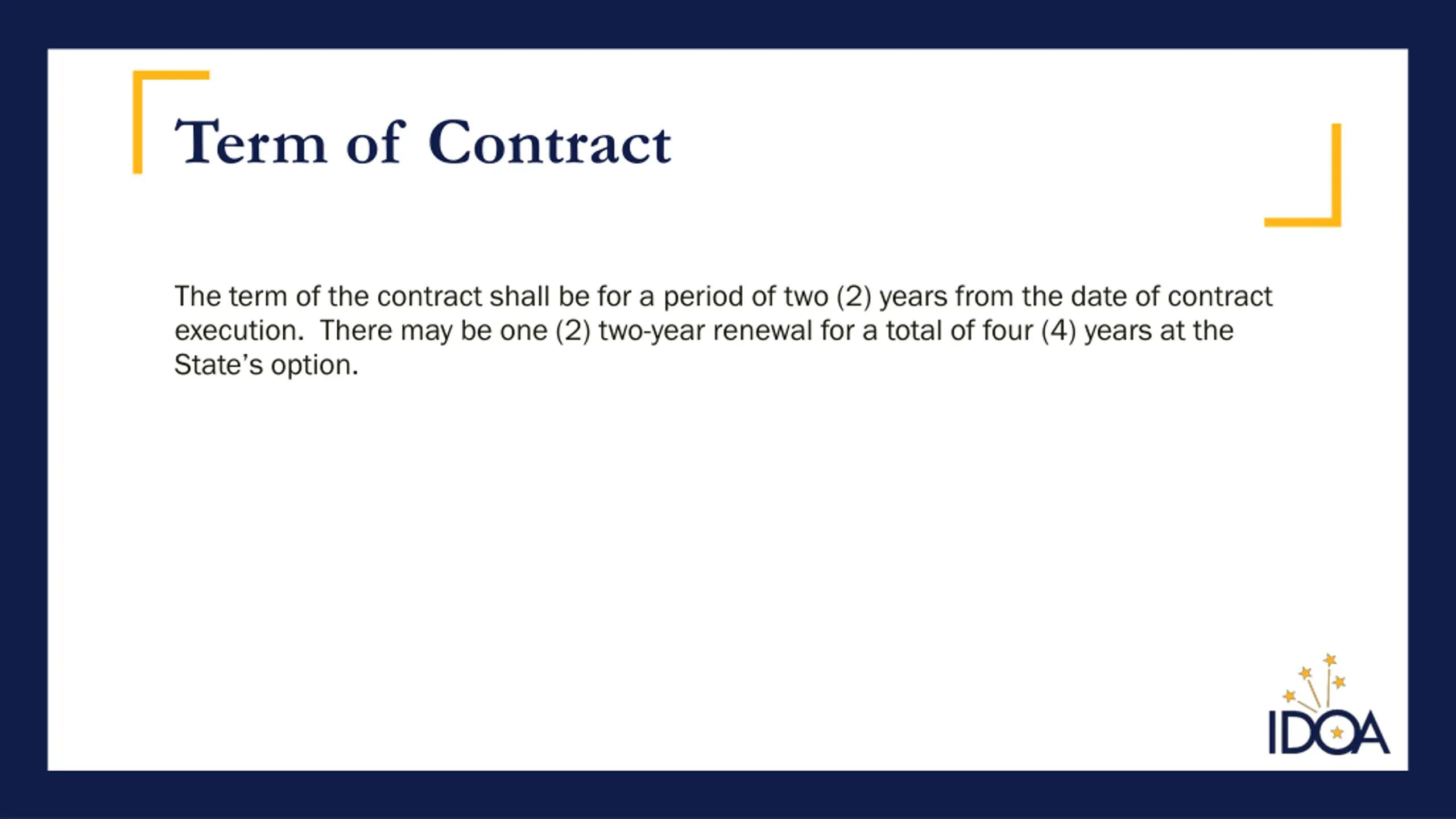 Term of Contract The term of the contract shall be for a period of two (2) years from the date of contract execution. There may be one (2) two-year renewal for a total of four (4) years at the State s option.