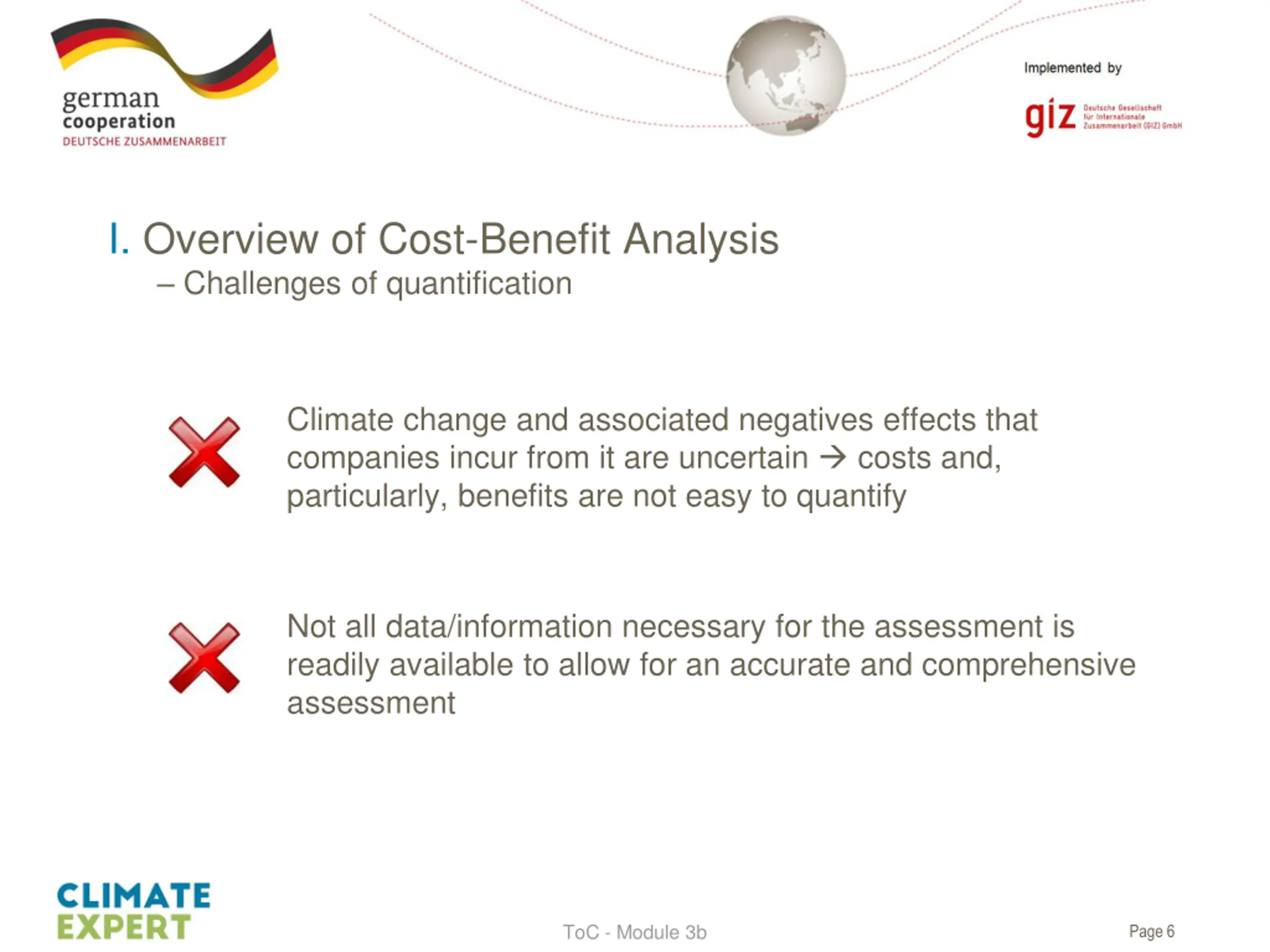 I. Overview of Cost-Benefit Analysis Relevance of quantification for businesses are particularly relevant for business operations help to compare and prioritize measures support the identification of the most suitable, effective and efficient adaptation measures Support for informed decision making! ToC - Module 3b Page 5