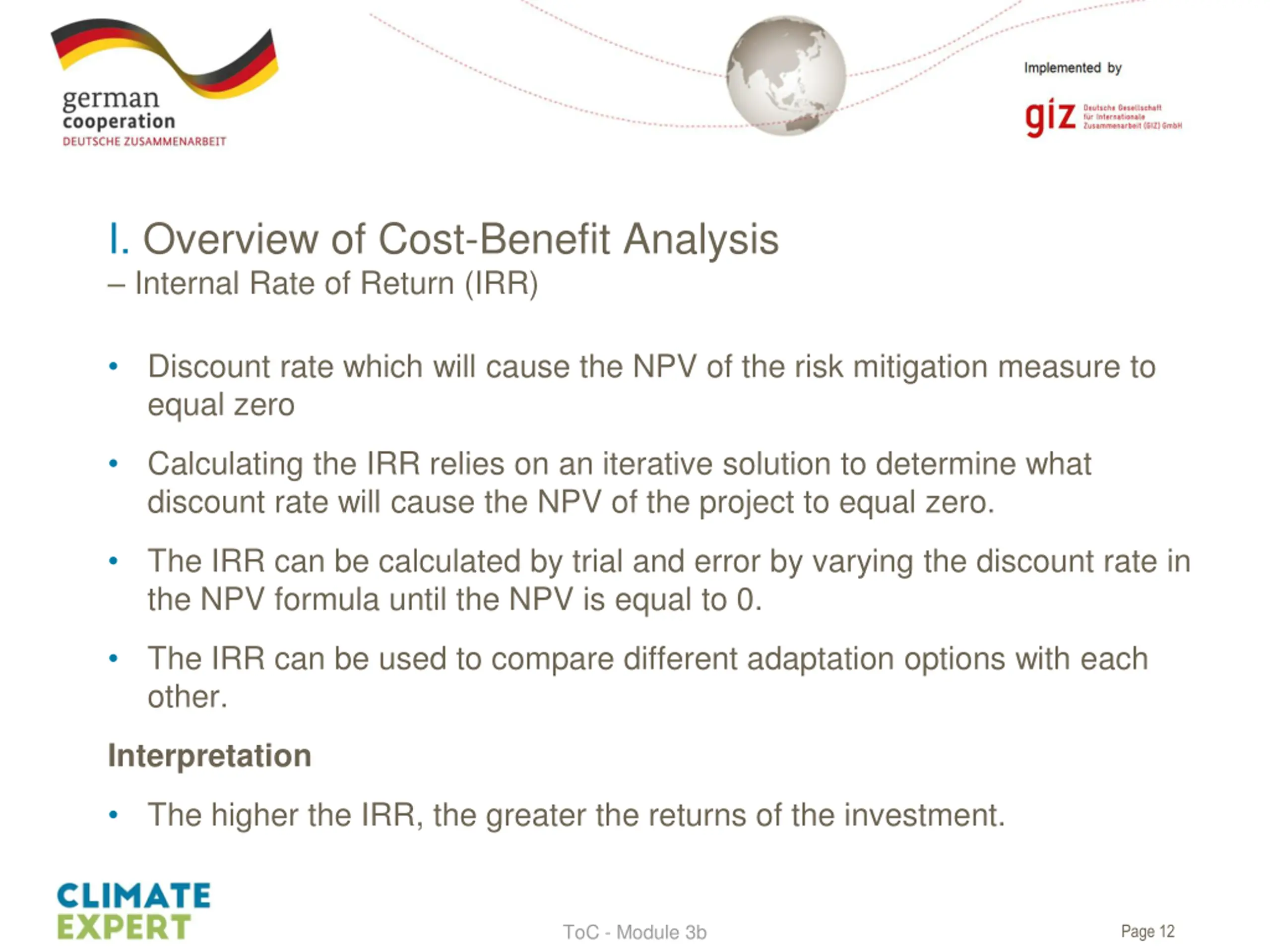 I. Overview of Cost-Benefit Analysis Internal Rate of Return (IRR) Discount rate which will cause the NPV of the risk mitigation measure to equal zero Calculating the IRR relies on an iterative solution to determine what discount rate will cause the NPV of the project to equal zero. The IRR can be calculated by trial and error by varying the discount rate in the NPV formula until the NPV is equal to 0. The IRR can be used to compare different adaptation options with each other. Interpretation The higher the IRR, the greater the returns of the investment. ToC - Module 3b Page 12