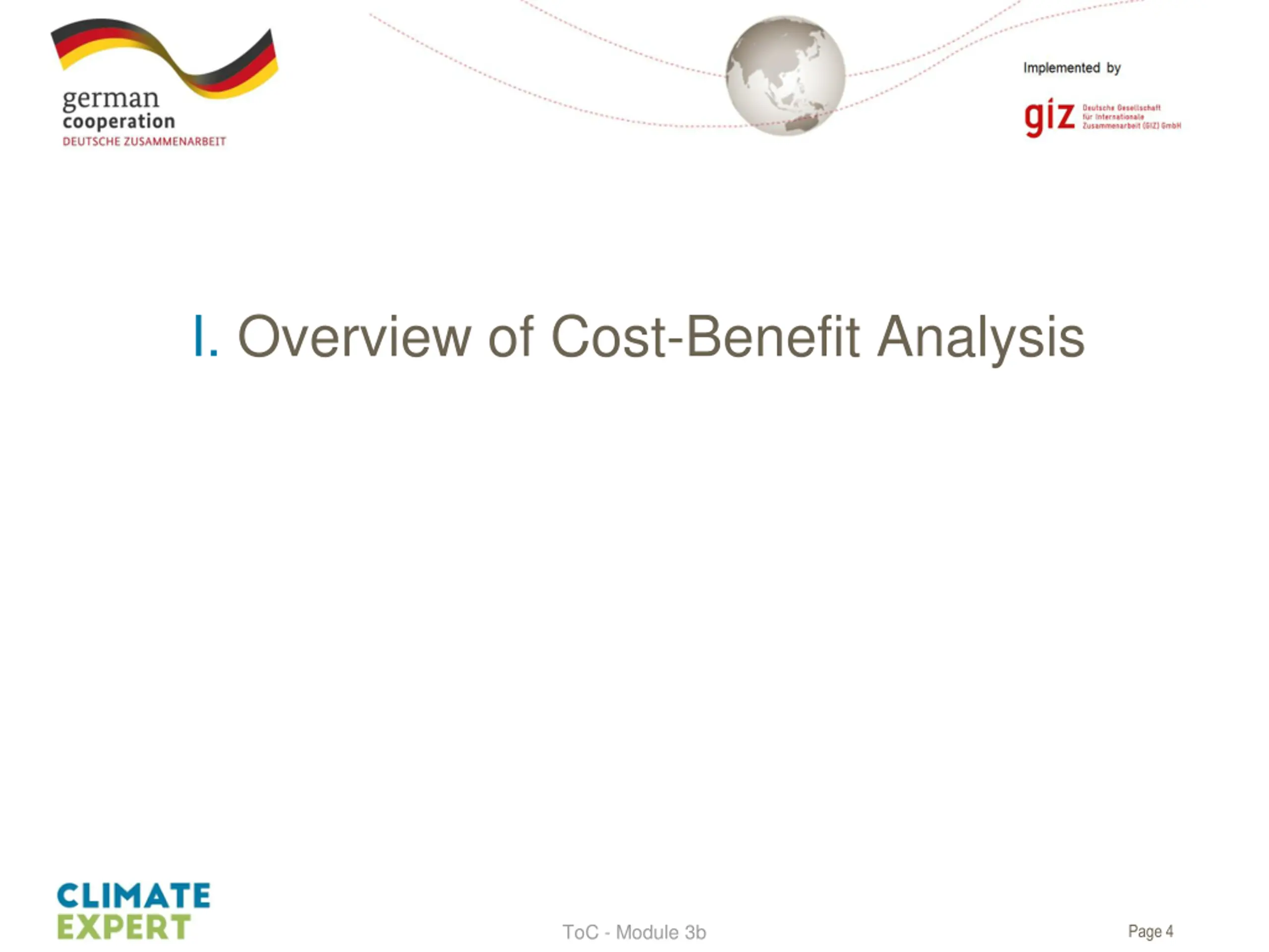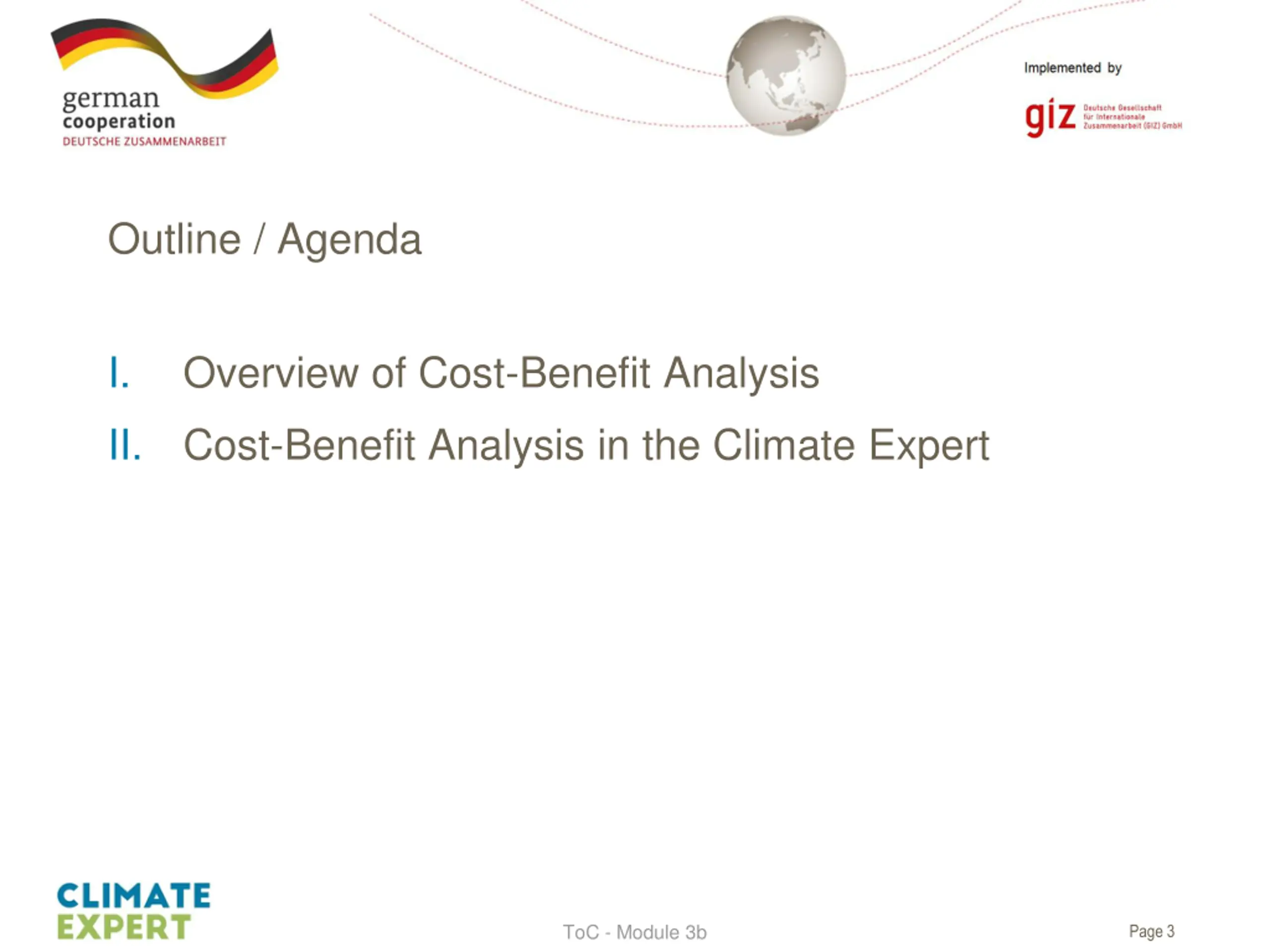 Outline / Agenda I. Overview of Cost-Benefit Analysis II. Cost-Benefit Analysis in the Climate Expert ToC - Module 3b Page 3