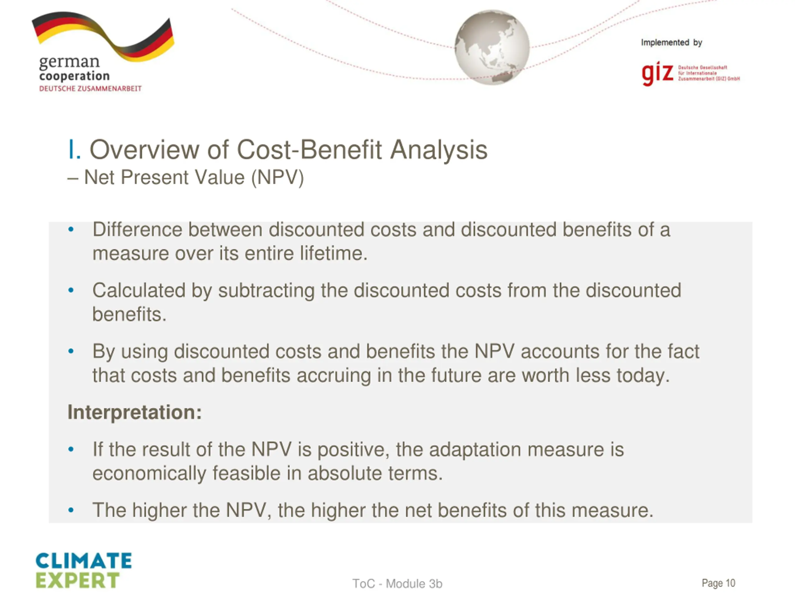 I. Overview of Cost-Benefit Analysis Net Present Value (NPV) Difference between discounted costs and discounted benefits of a measure over its entire lifetime. Calculated by subtracting the discounted costs from the discounted benefits. By using discounted costs and benefits the NPV accounts for the fact that costs and benefits accruing in the future are worth less today. Interpretation: If the result of the NPV is positive, the adaptation measure is economically feasible in absolute terms. The higher the NPV, the higher the net benefits of this measure. ToC - Module 3b Page 10