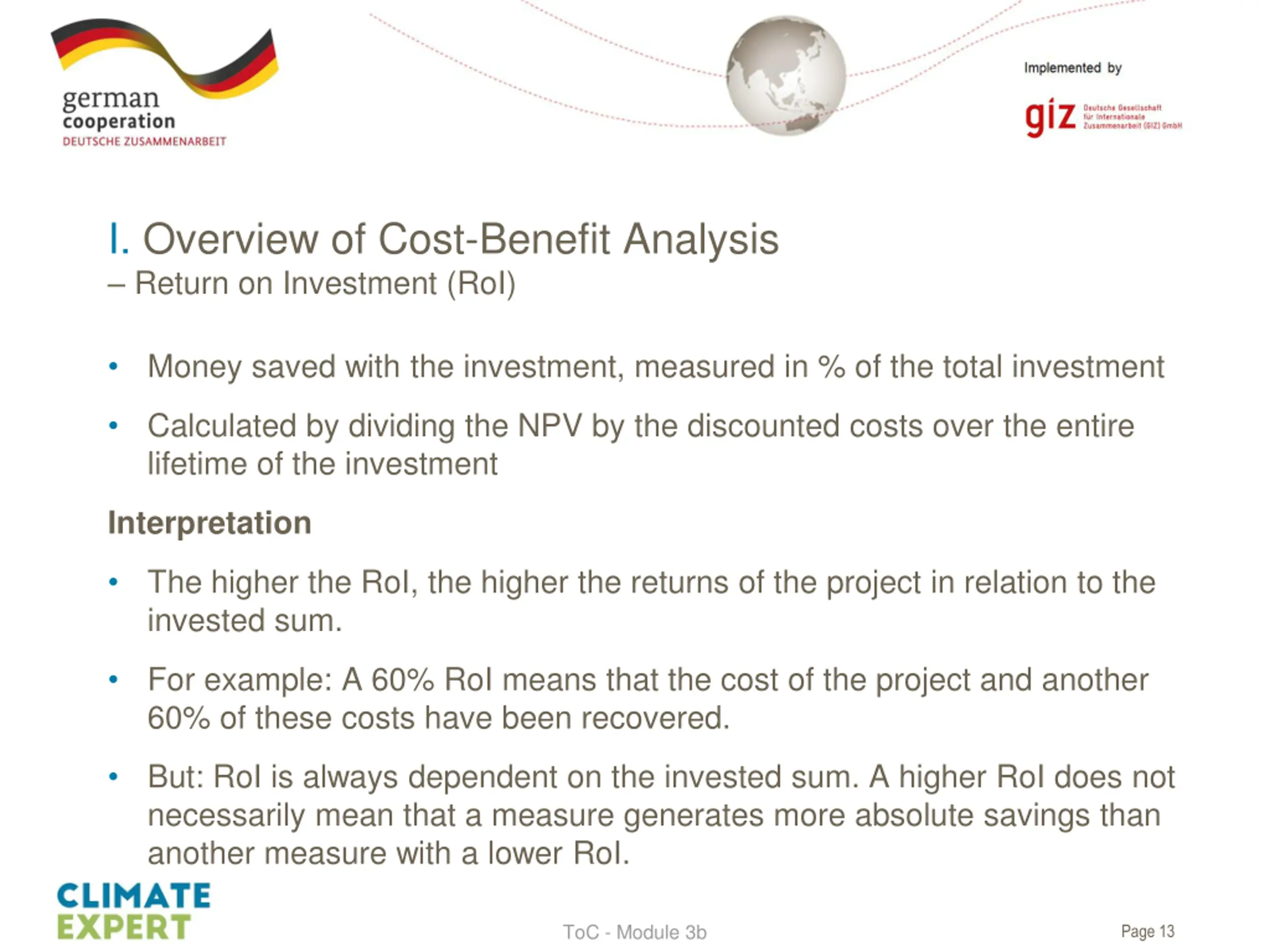 I. Overview of Cost-Benefit Analysis Return on Investment (RoI) Money saved with the investment, measured in % of the total investment Calculated by dividing the NPV by the discounted costs over the entire lifetime of the investment Interpretation The higher the RoI, the higher the returns of the project in relation to the invested sum. For example: A 60% RoI means that the cost of the project and another 60% of these costs have been recovered. But: RoI is always dependent on the invested sum. A higher RoI does not necessarily mean that a measure generates more absolute savings than another measure with a lower RoI. ToC - Module 3b Page 13
