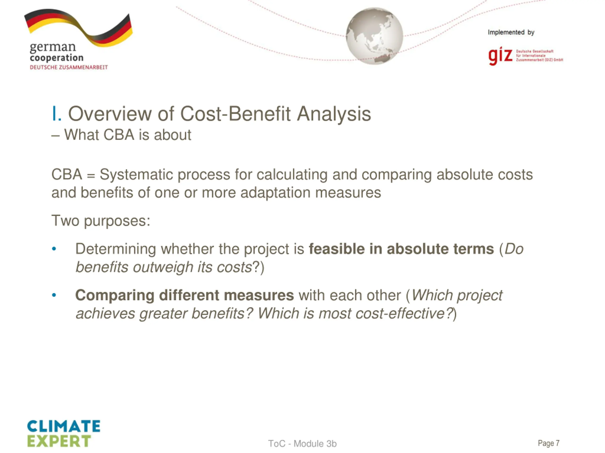 I. Overview of Cost-Benefit Analysis What CBA is about CBA = Systematic process for calculating and comparing absolute costs and benefits of one or more adaptation measures Two purposes: Determining whether the project is feasible in absolute terms (Do benefits outweigh its costs?) Comparing different measures with each other (Which project achieves greater benefits? Which is most cost-effective?) ToC - Module 3b Page 7