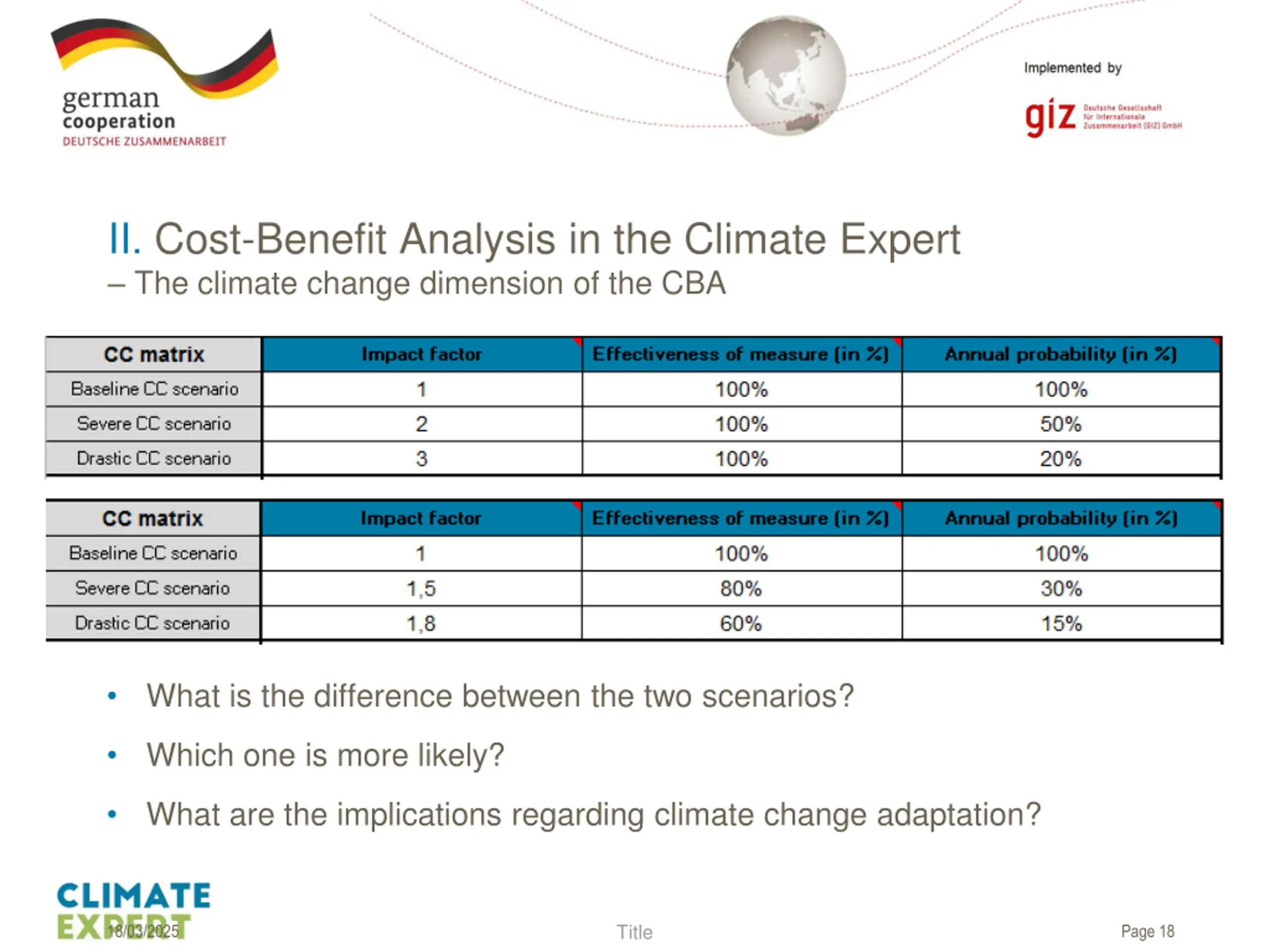 II. Cost-Benefit Analysis in the Climate Expert The climate change dimension of the CBA What is the difference between the two scenarios? Which one is more likely? What are the implications regarding climate change adaptation? Title 18/03/2025 Page 18