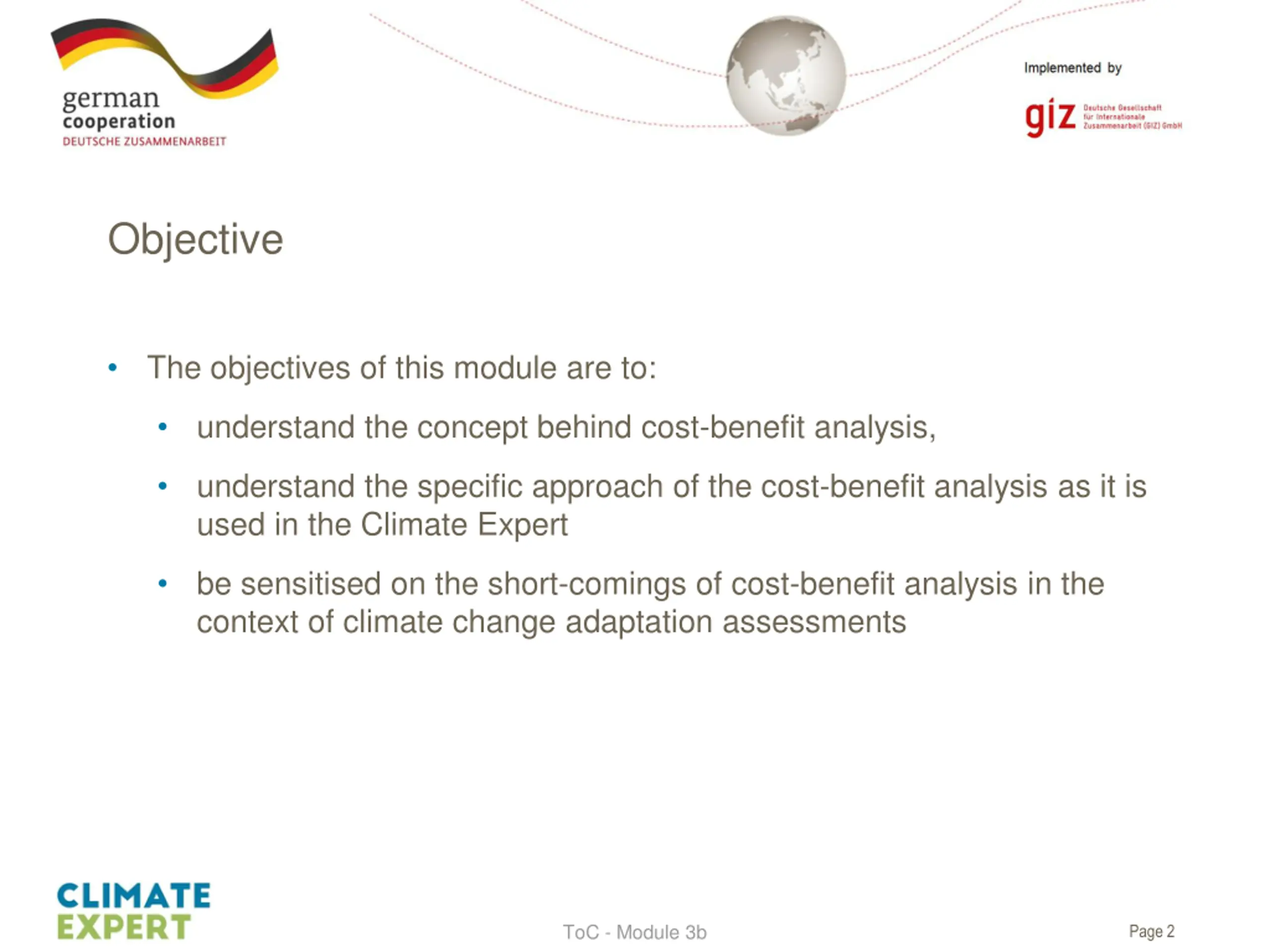 Objective The objectives of this module are to: understand the concept behind cost-benefit analysis, understand the specific approach of the cost-benefit analysis as it is used in the Climate Expert be sensitised on the short-comings of cost-benefit analysis in the context of climate change adaptation assessments ToC - Module 3b Page 2