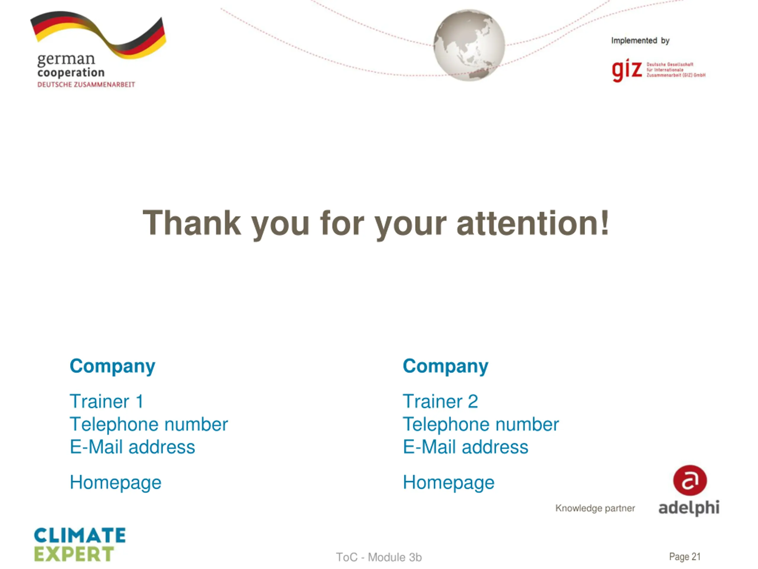 Thank you for your attention! Company Company Trainer 1 Telephone number E-Mail address Trainer 2 Telephone number E-Mail address Homepage Homepage Knowledge partner ToC - Module 3b Page 21