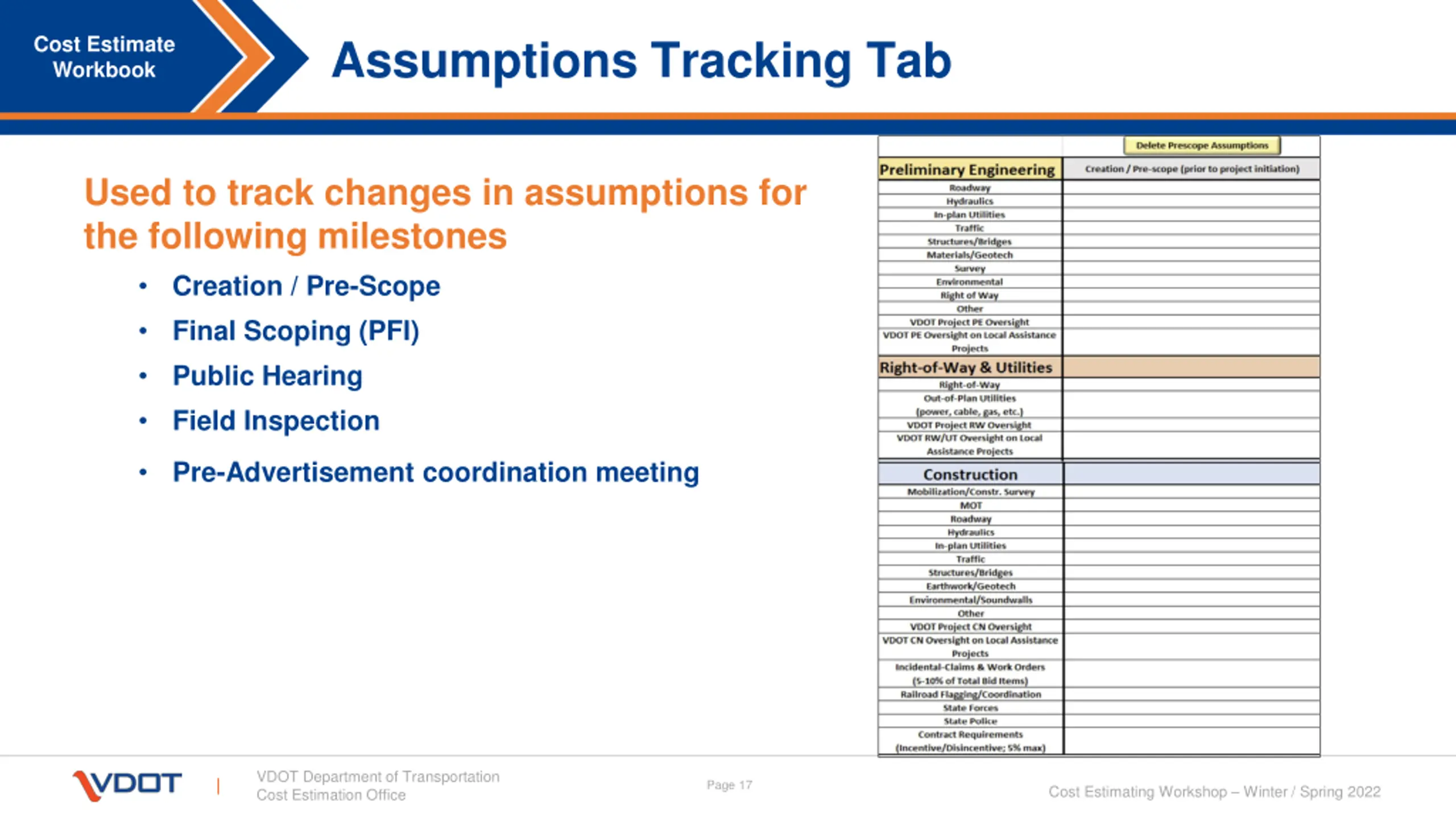 Cost Estimate Tracking Tab Cost Estimate Workbook Used to track variations in the cost estimate of the following milestones Creation / Pre-Scope Final Scoping (PFI) Public Hearing Field Inspection Pre-Advertisement coordination meeting VDOT Department of Transportation Cost Estimation Office Page 16 Cost Estimating Workshop Winter / Spring 2022