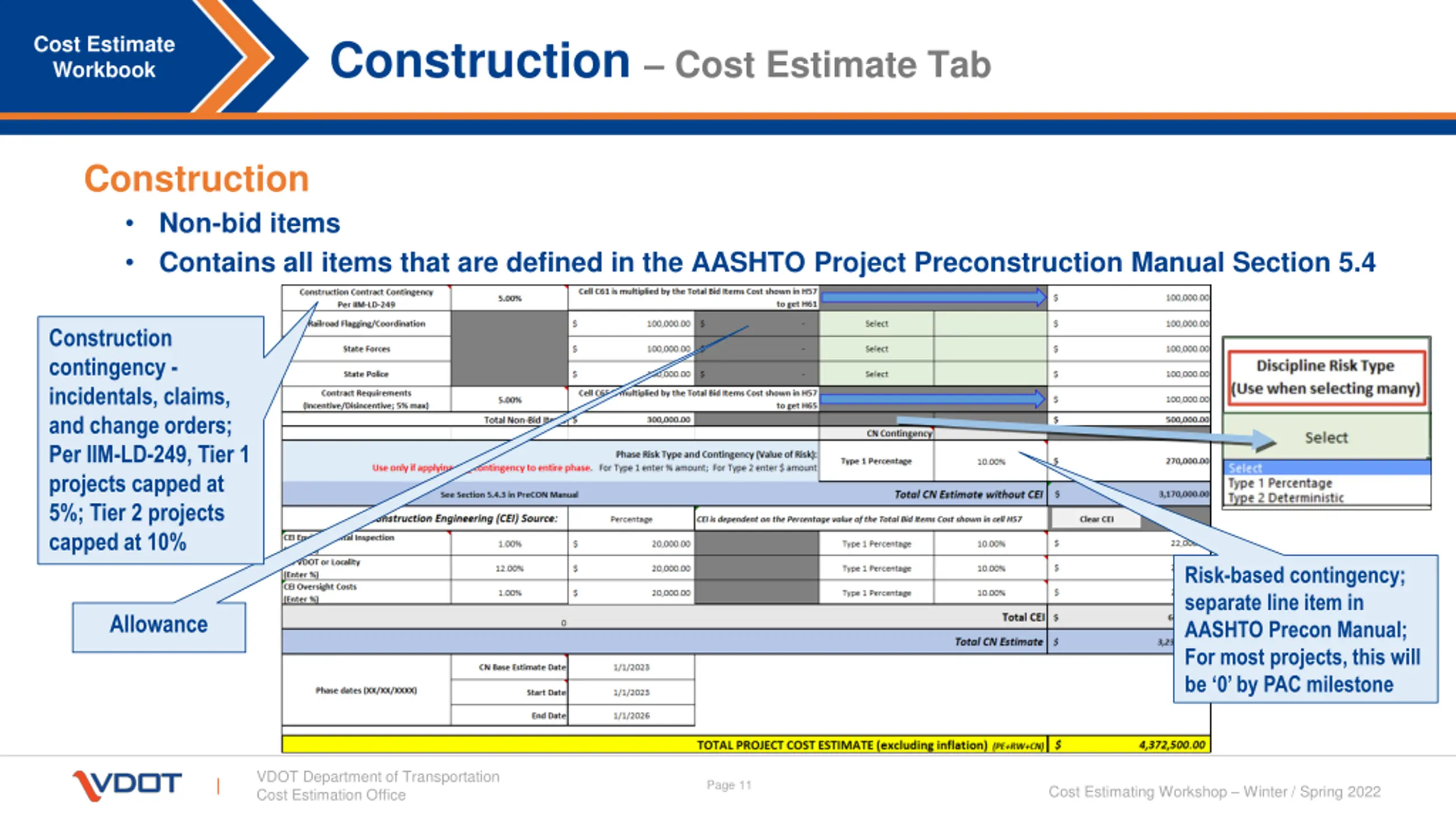 Construction Cost Estimate Tab Cost Estimate Workbook Construction Non-bid items Contains all items that are defined in the AASHTO Project Preconstruction Manual Section 5.4 Construction contingency - incidentals, claims, and change orders; Per IIM-LD-249, Tier 1 projects capped at 5%; Tier 2 projects capped at 10% Risk-based contingency; separate line item in AASHTO Precon Manual; For most projects, this will be 0 by PAC milestone Allowance VDOT Department of Transportation Cost Estimation Office Page 11 Cost Estimating Workshop Winter / Spring 2022