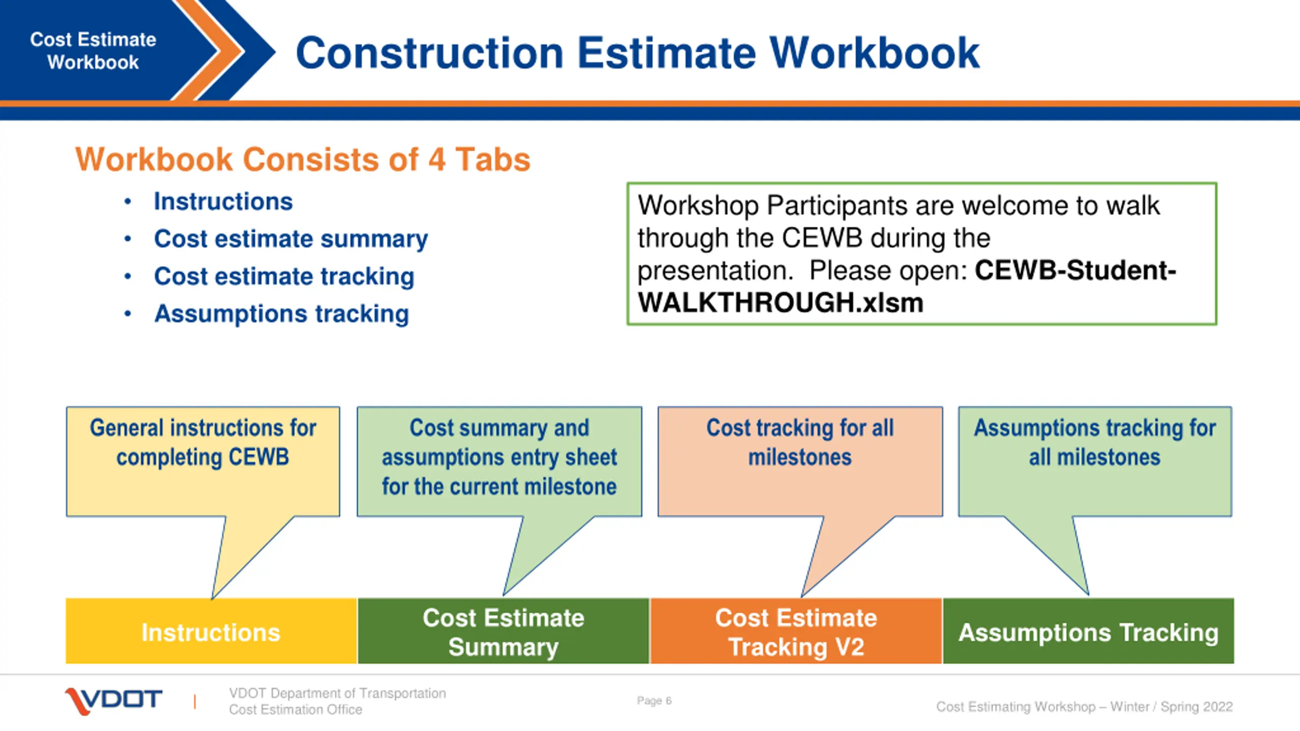 Construction Estimate Workbook Cost Estimate Workbook Workbook Consists of 4 Tabs Instructions Cost estimate summary Cost estimate tracking Assumptions tracking Workshop Participants are welcome to walk through the CEWB during the presentation. Please open: CEWB-Student- WALKTHROUGH.xlsm General instructions for completing CEWB Cost summary and assumptions entry sheet for the current milestone Cost tracking for all milestones Assumptions tracking for all milestones Cost Estimate Summary Cost Estimate Tracking V2 Instructions Assumptions Tracking VDOT Department of Transportation Cost Estimation Office Page 6 Cost Estimating Workshop Winter / Spring 2022