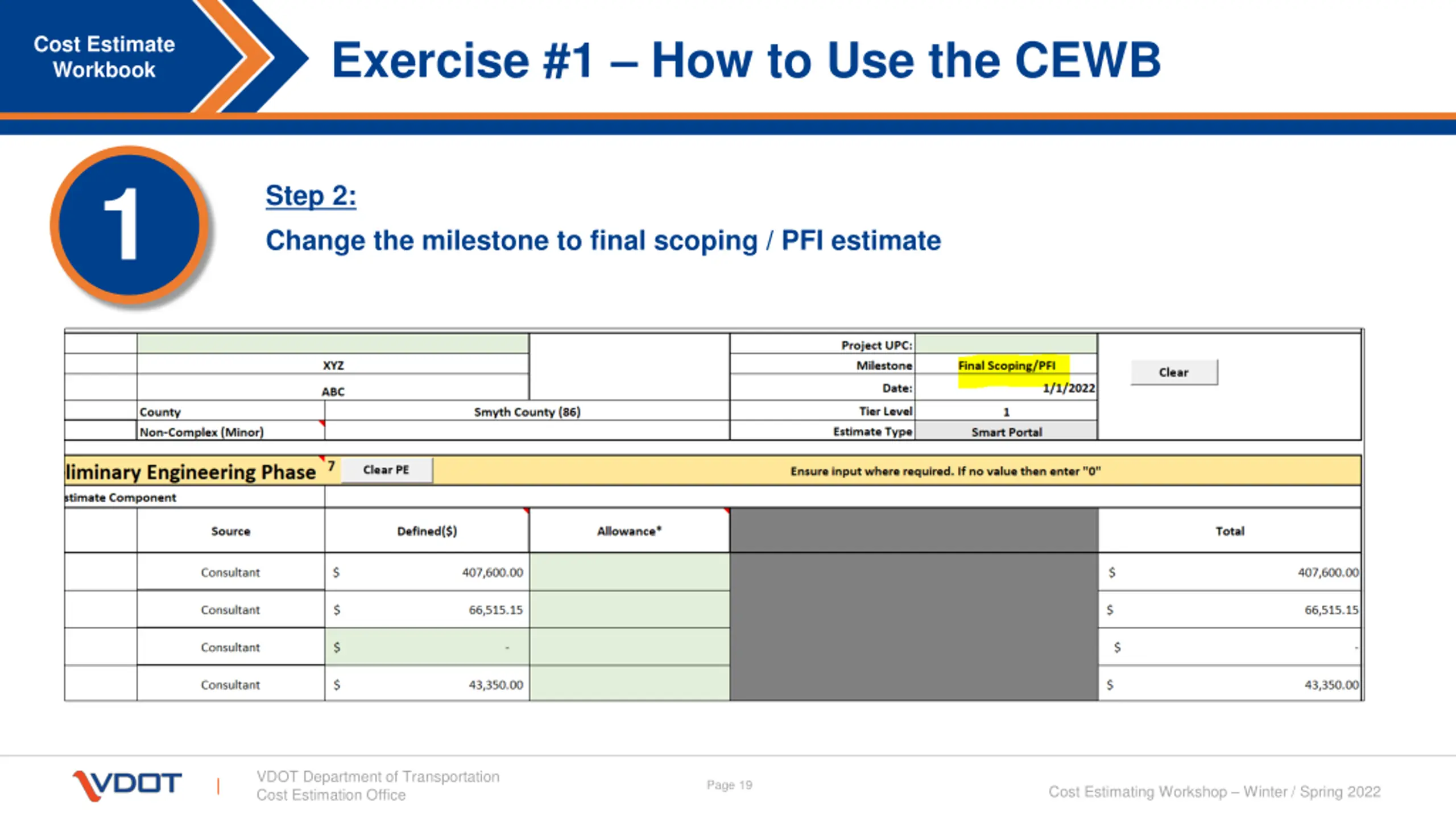 Exercise #1 How to Use the CEWB Cost Estimate Workbook 1 Step 2: Change the milestone to final scoping / PFI estimate VDOT Department of Transportation Cost Estimation Office Page 19 Cost Estimating Workshop Winter / Spring 2022