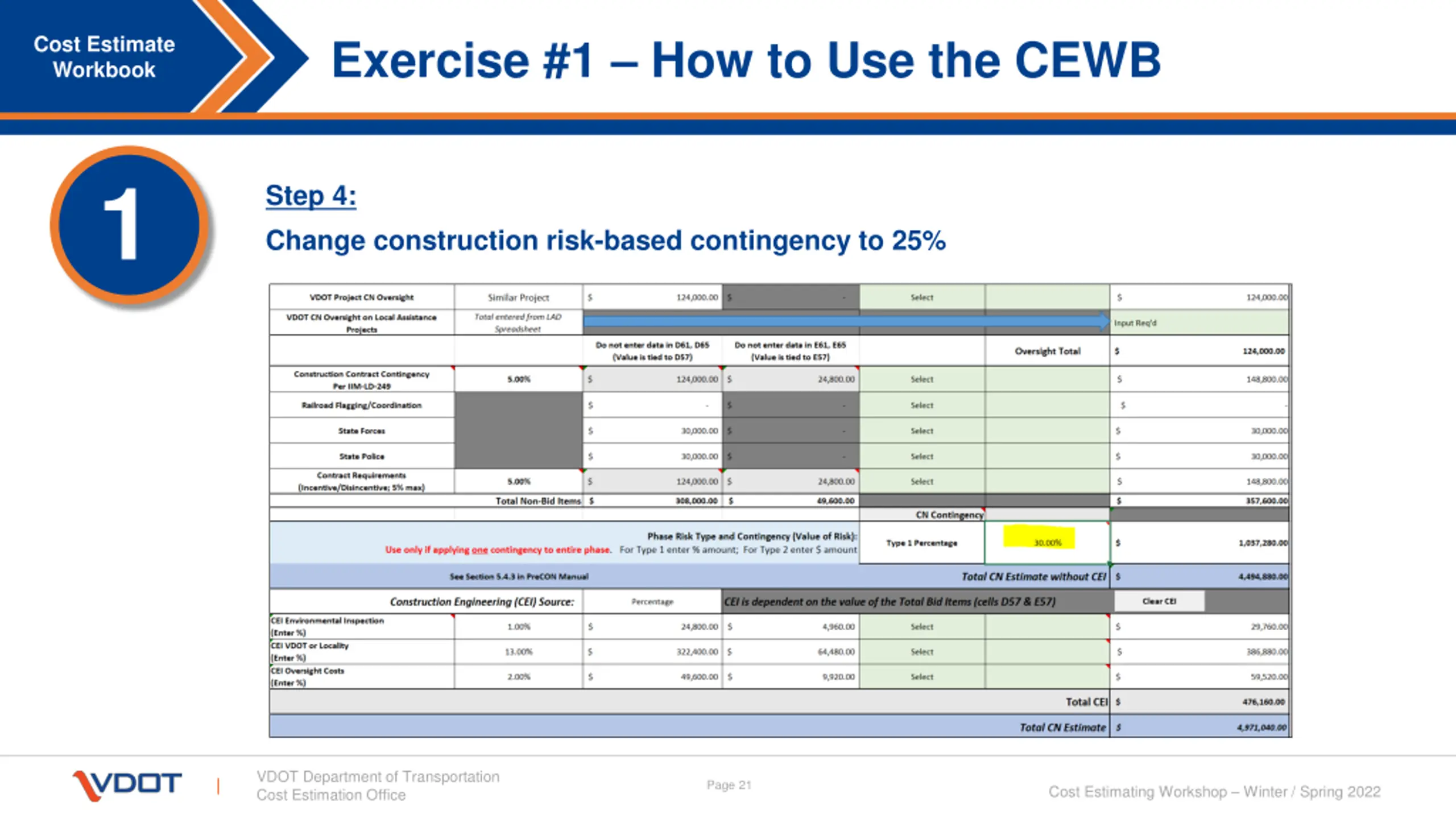 Exercise #1 How to Use the CEWB Cost Estimate Workbook 1 Step 4: Change construction risk-based contingency to 25% VDOT Department of Transportation Cost Estimation Office Page 21 Cost Estimating Workshop Winter / Spring 2022