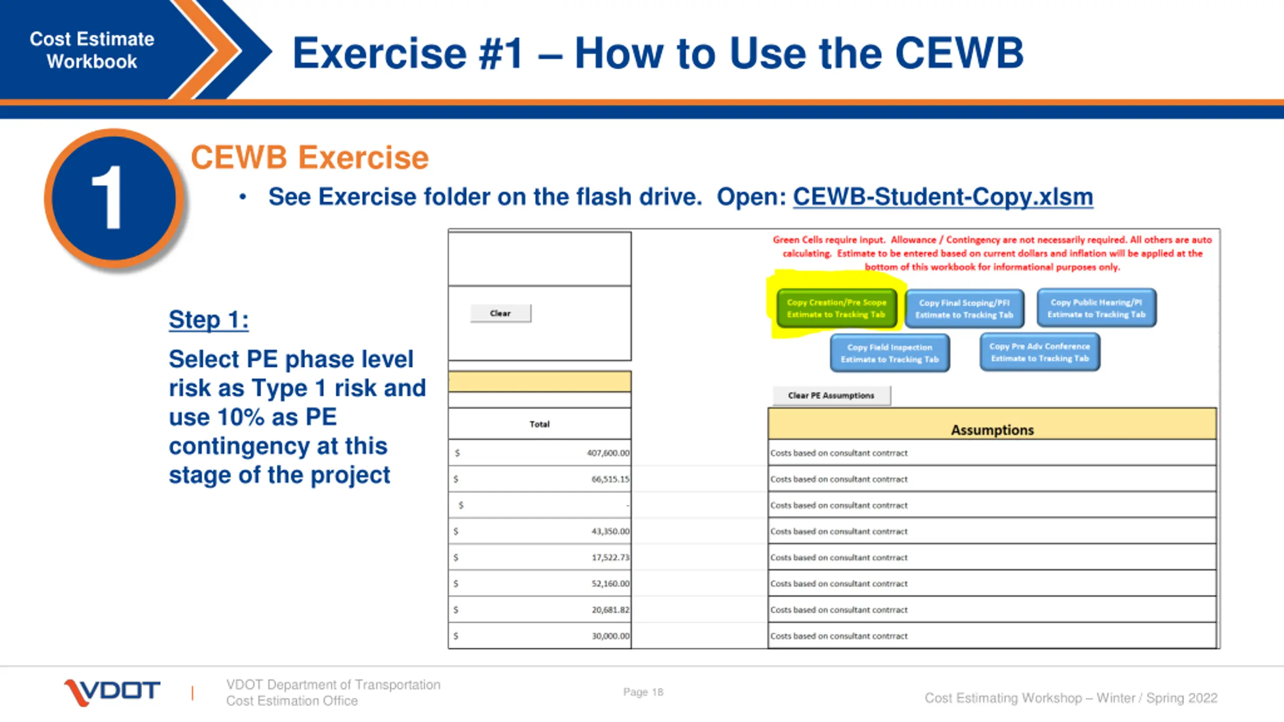 Exercise #1 How to Use the CEWB Cost Estimate Workbook CEWB Exercise See Exercise folder on the flash drive. Open: CEWB-Student-Copy.xlsm 1 Step 1: Select PE phase level risk as Type 1 risk and use 10% as PE contingency at this stage of the project VDOT Department of Transportation Cost Estimation Office Page 18 Cost Estimating Workshop Winter / Spring 2022