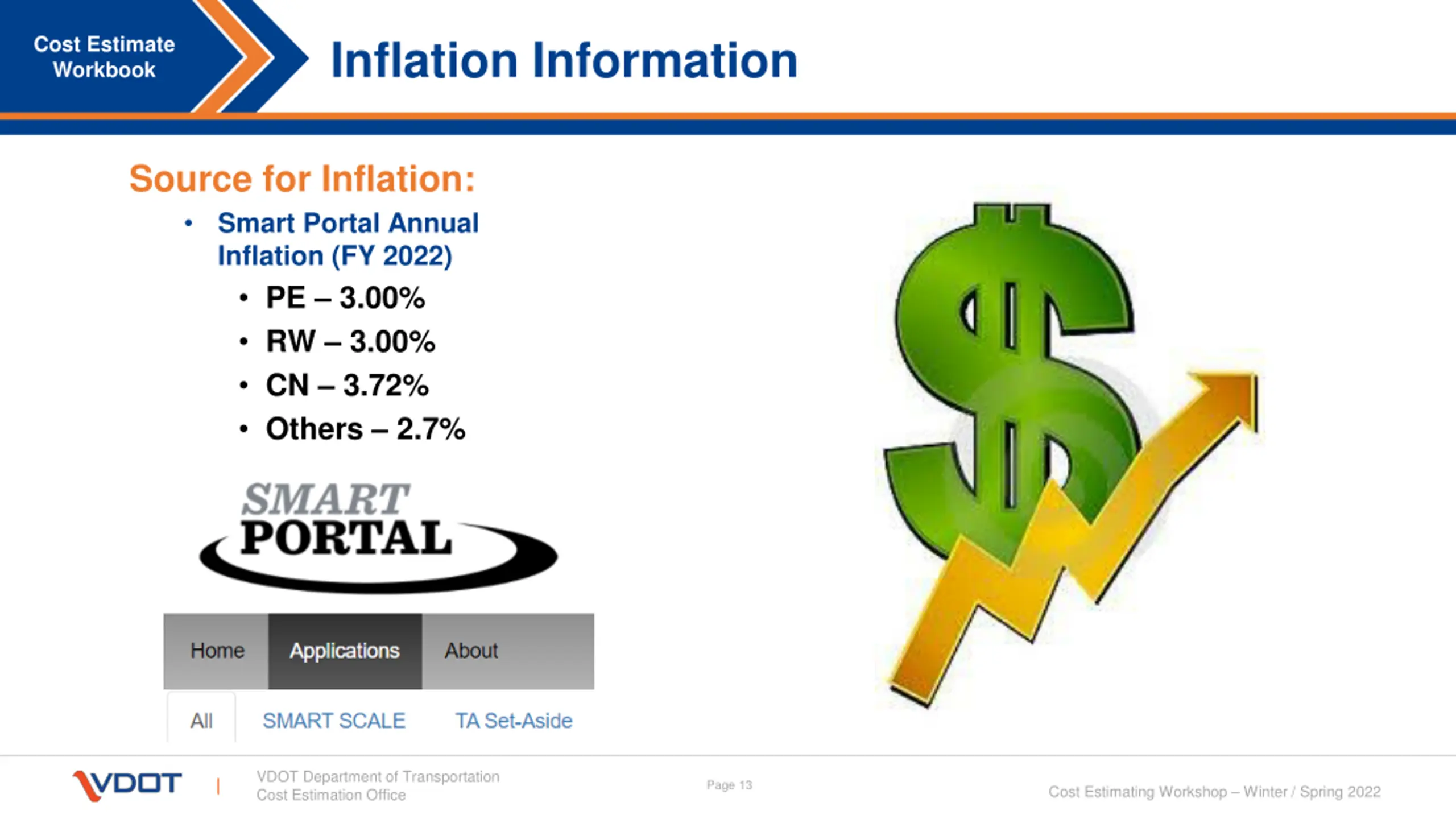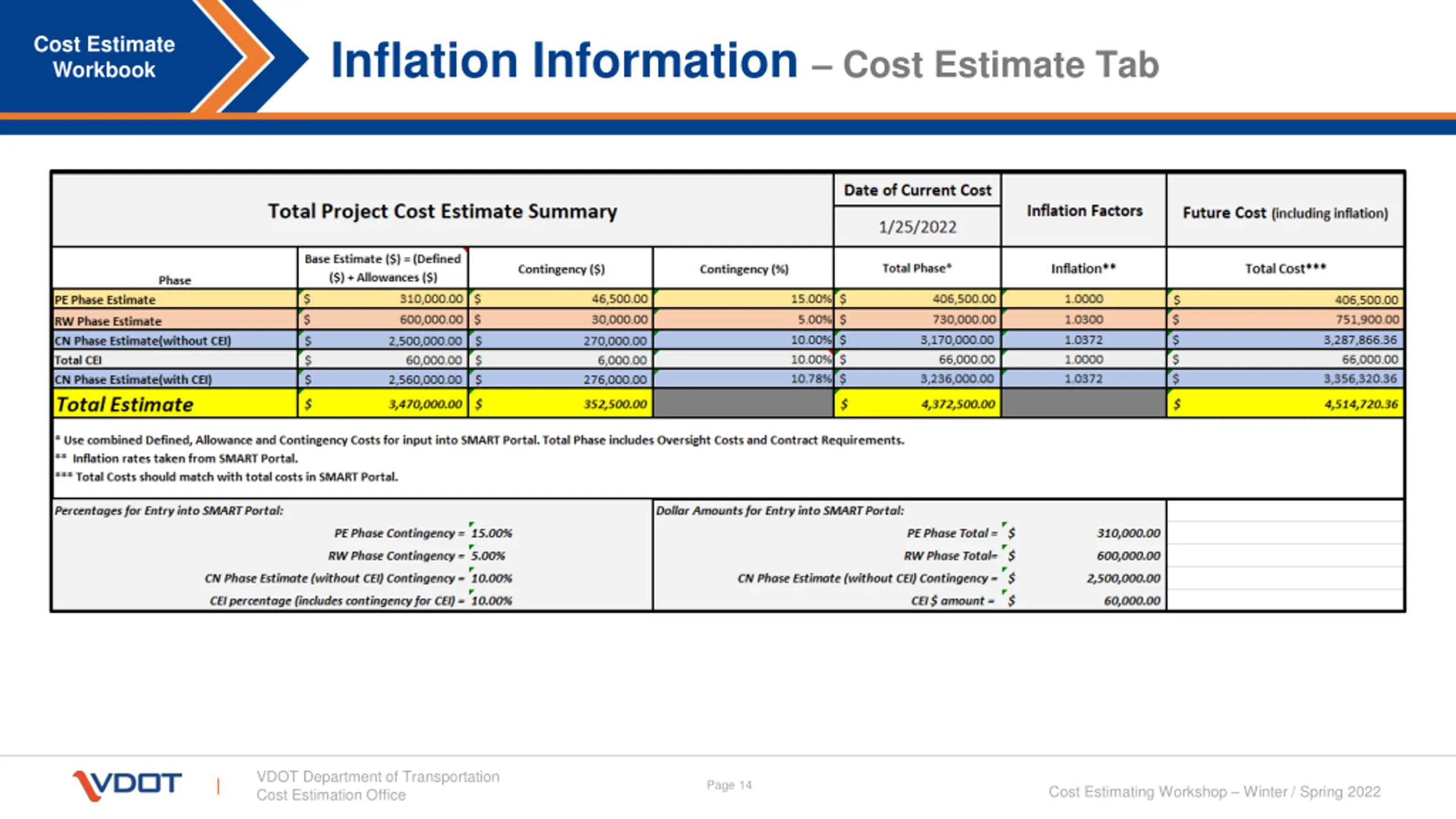 Inflation Information Cost Estimate Workbook Source for Inflation: Smart Portal Annual Inflation (FY 2022) PE 3.00% RW 3.00% CN 3.72% Others 2.7% VDOT Department of Transportation Cost Estimation Office Page 13 Cost Estimating Workshop Winter / Spring 2022