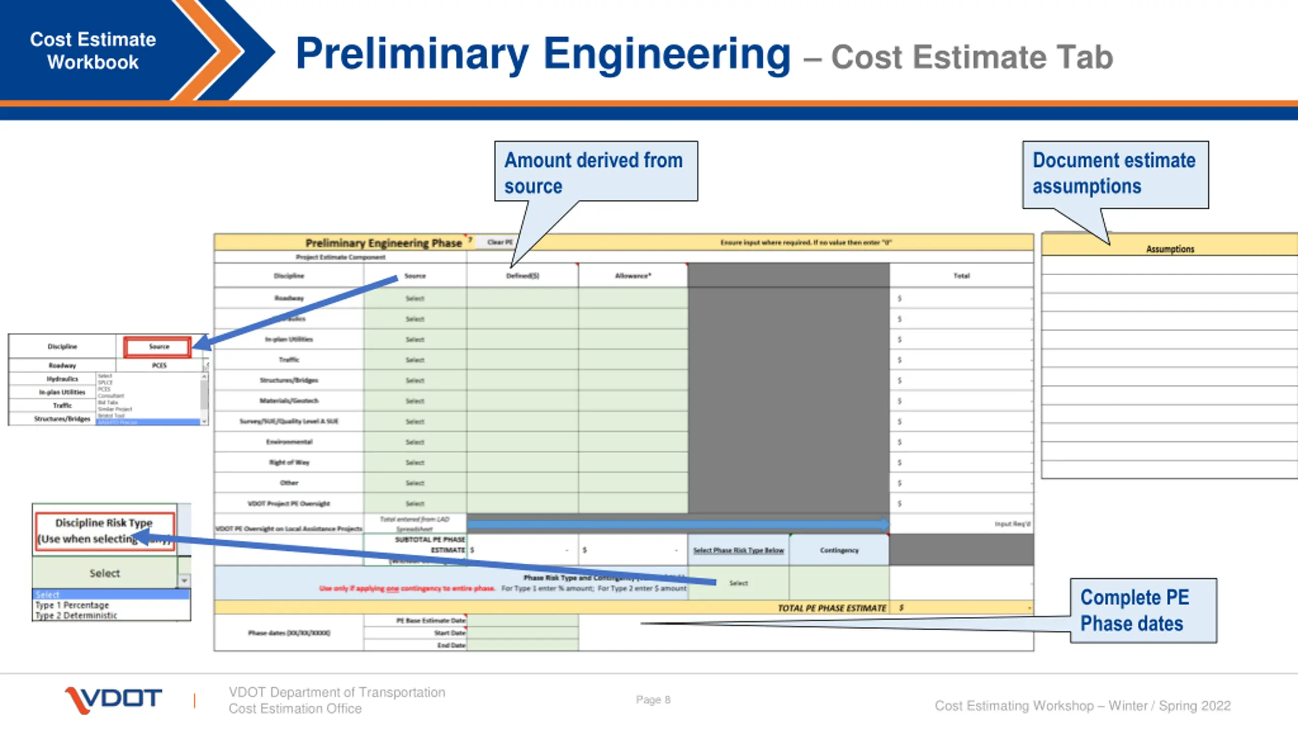 Preliminary Engineering Cost Estimate Tab Cost Estimate Workbook Amount derived from source Document estimate assumptions Complete PE Phase dates VDOT Department of Transportation Cost Estimation Office Page 8 Cost Estimating Workshop Winter / Spring 2022