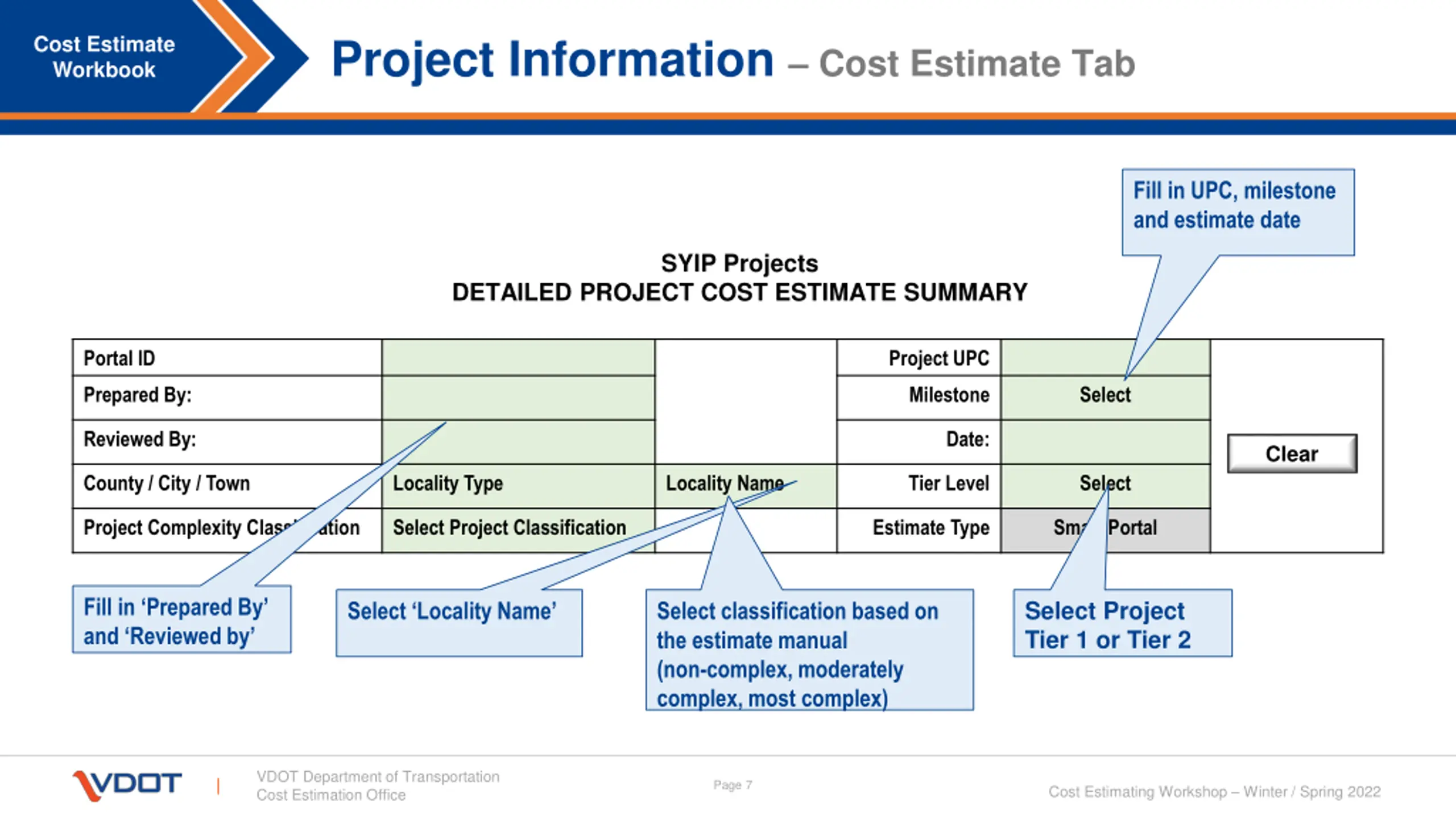 Project Information Cost Estimate Tab Cost Estimate Workbook Fill in UPC, milestone and estimate date SYIP Projects DETAILED PROJECT COST ESTIMATE SUMMARY Portal ID Project UPC Prepared By: Milestone Select Reviewed By: Date: Clear County / City / Town Locality Type Locality Name Tier Level Select Project Complexity Classification Select Project Classification Estimate Type Smart Portal Fill in Prepared By and Reviewed by Select Project Tier 1 or Tier 2 Select Locality Name Select classification based on the estimate manual (non-complex, moderately complex, most complex) VDOT Department of Transportation Cost Estimation Office Page 7 Cost Estimating Workshop Winter / Spring 2022