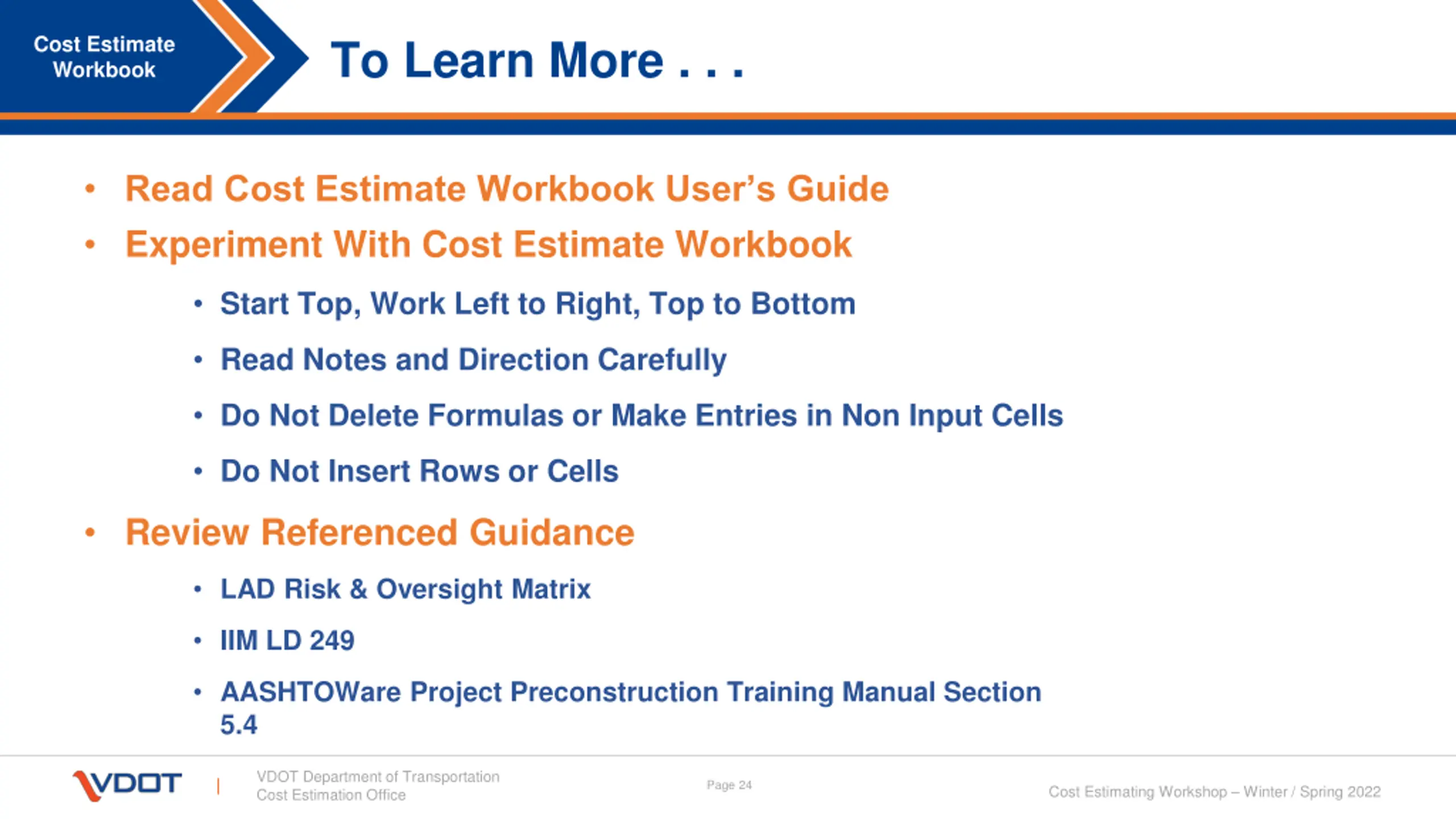 To Learn More . . . Cost Estimate Workbook Read Cost Estimate Workbook User s Guide Experiment With Cost Estimate Workbook Start Top, Work Left to Right, Top to Bottom Read Notes and Direction Carefully Do Not Delete Formulas or Make Entries in Non Input Cells Do Not Insert Rows or Cells Review Referenced Guidance LAD Risk & Oversight Matrix IIM LD 249 AASHTOWare Project Preconstruction Training Manual Section 5.4 VDOT Department of Transportation Cost Estimation Office Page 24 Cost Estimating Workshop Winter / Spring 2022