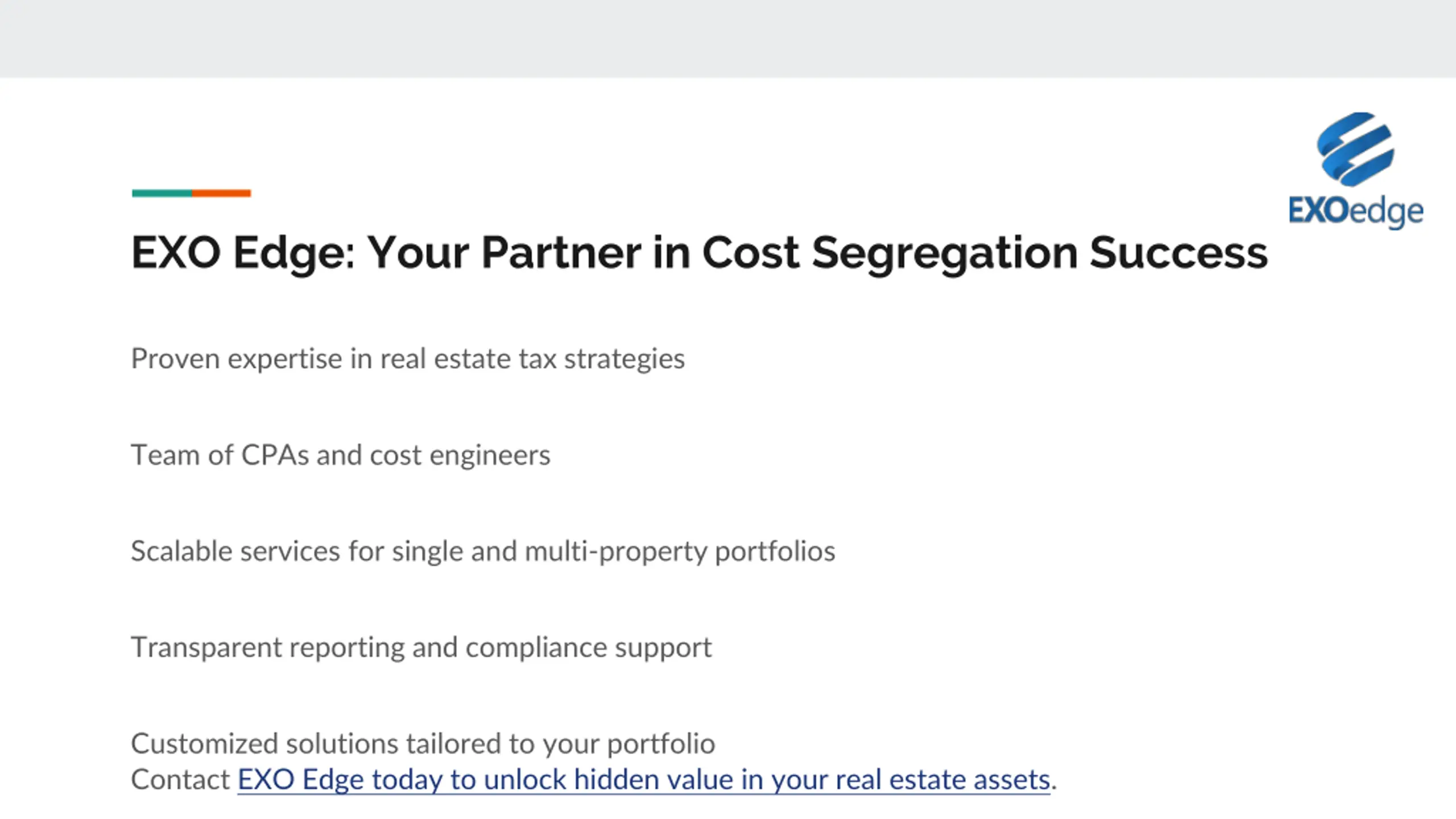 EXO Edge: Your Partner in Cost Segregation Success Proven expertise in real estate tax strategies Team of CPAs and cost engineers Scalable services for single and multi-property portfolios Transparent reporting and compliance support Customized solutions tailored to your portfolio Contact EXO Edge today to unlock hidden value in your real estate assets.