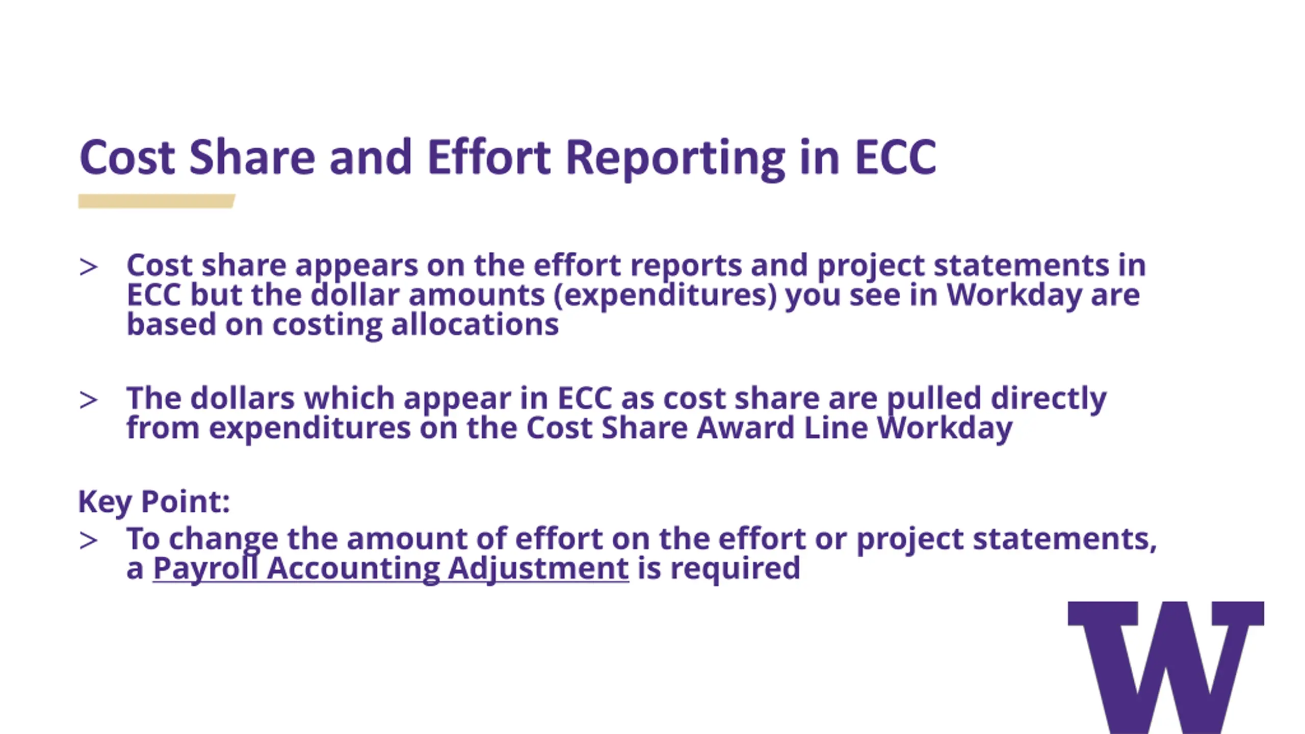 Cost Share and Effort Reporting in ECC > Cost share appears on the effort reports and project statements in ECC but the dollar amounts (expenditures) you see in Workday are based on costing allocations > The dollars which appear in ECC as cost share are pulled directly from expenditures on the Cost Share Award Line Workday Key Point: > To change the amount of effort on the effort or project statements, a Payroll Accounting Adjustment is required