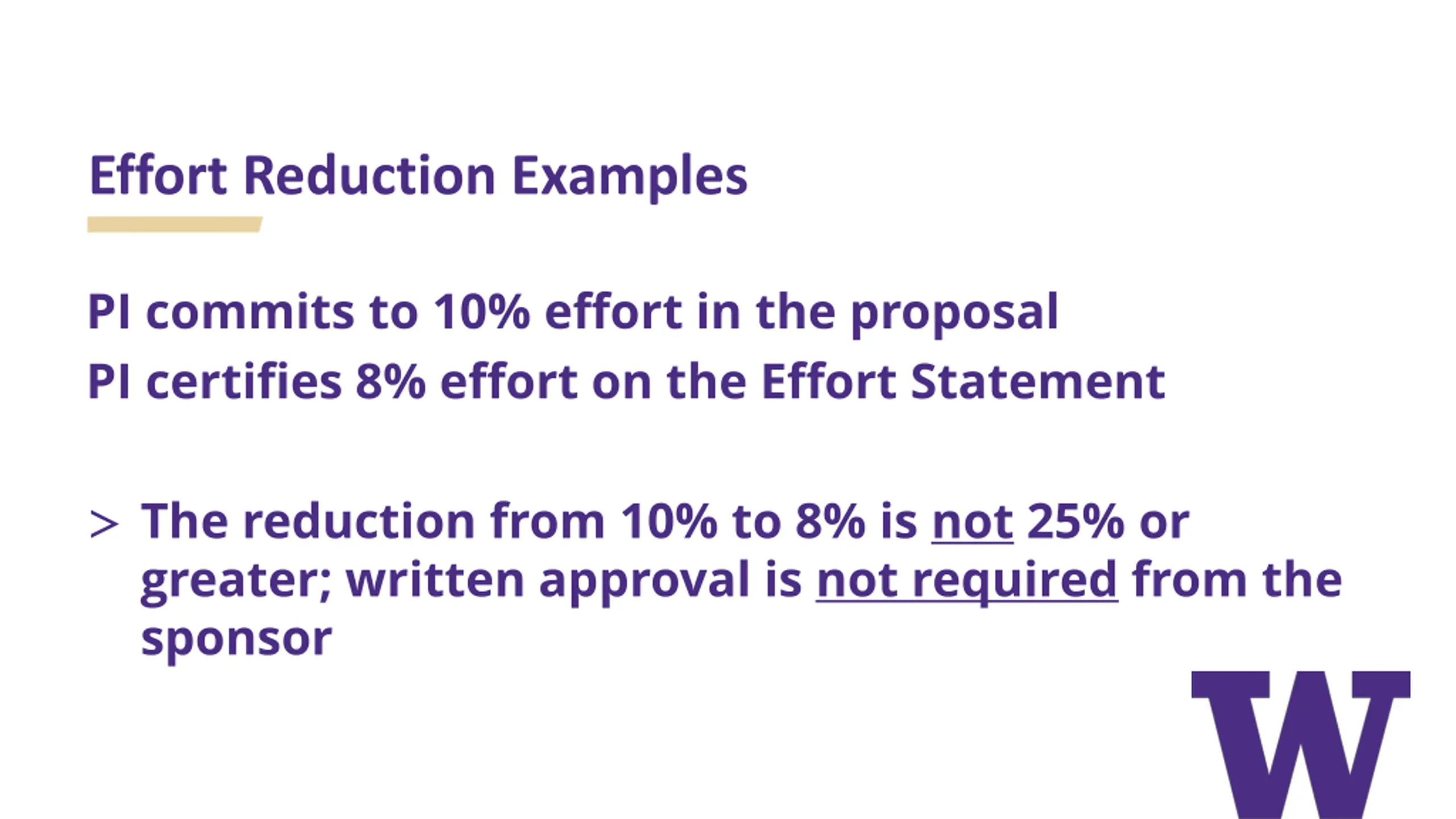 Effort Reduction Examples PI commits to 10% effort in the proposal PI certifies 8% effort on the Effort Statement > The reduction from 10% to 8% is not 25% or greater; written approval is not required from the sponsor