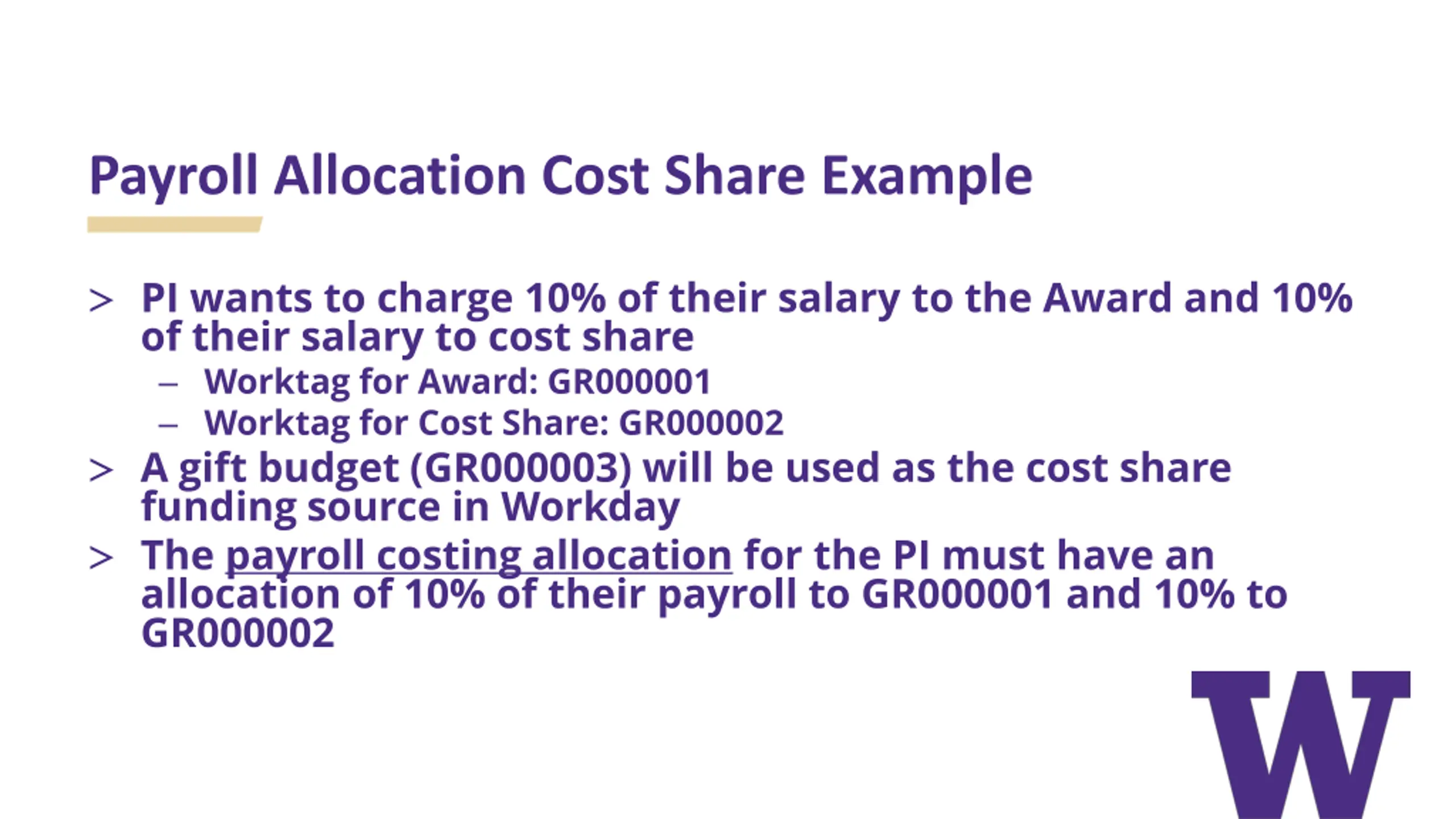 Payroll Allocation Cost Share Example > PI wants to charge 10% of their salary to the Award and 10% of their salary to cost share Worktag for Award: GR000001 Worktag for Cost Share: GR000002 > A gift budget (GR000003) will be used as the cost share funding source in Workday > The payroll costing allocation for the PI must have an allocation of 10% of their payroll to GR000001 and 10% to GR000002