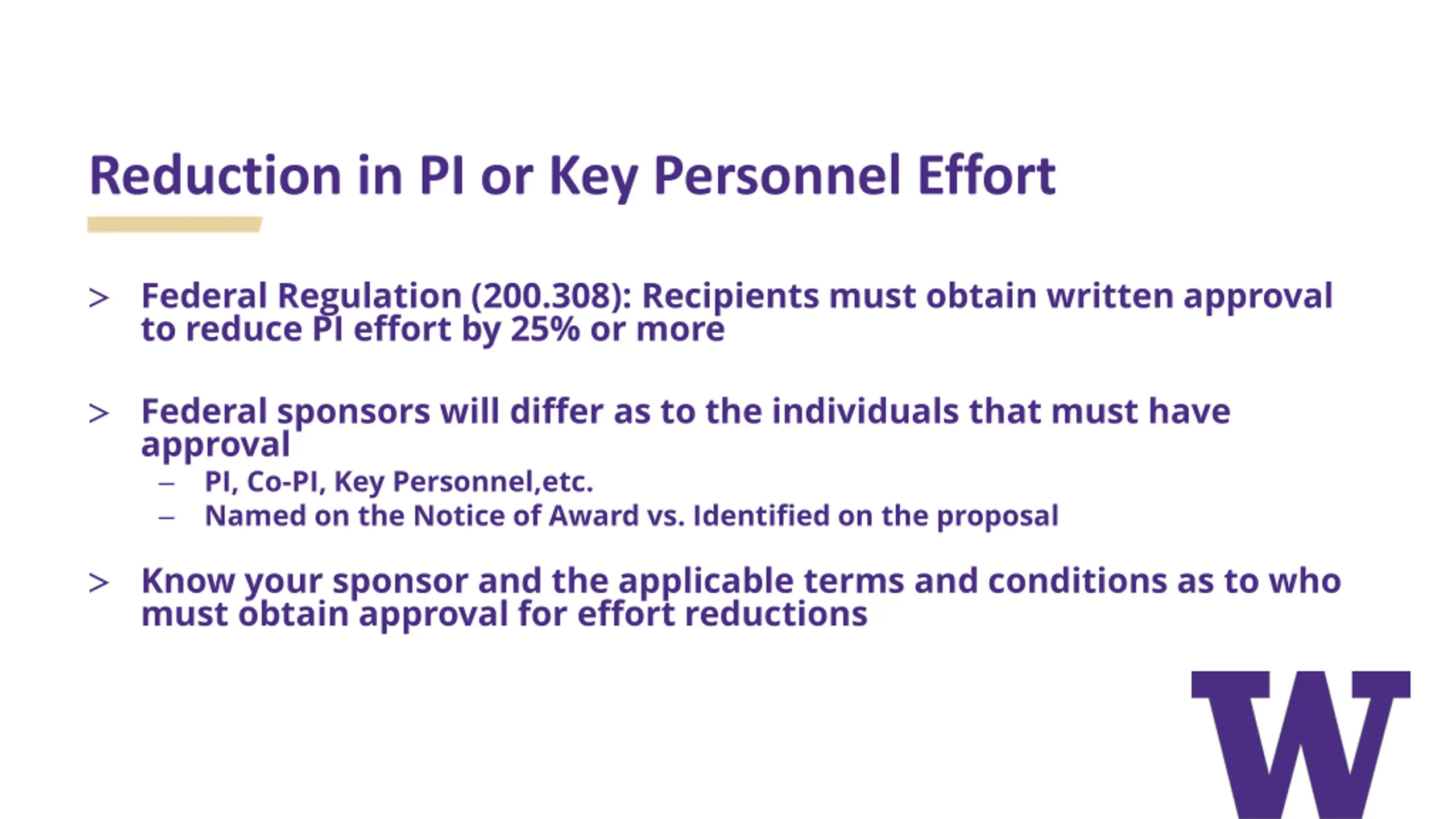 Reduction in PI or Key Personnel Effort > Federal Regulation (200.308): Recipients must obtain written approval to reduce PI effort by 25% or more > Federal sponsors will differ as to the individuals that must have approval PI, Co-PI, Key Personnel,etc. Named on the Notice of Award vs. Identified on the proposal > Know your sponsor and the applicable terms and conditions as to who must obtain approval for effort reductions